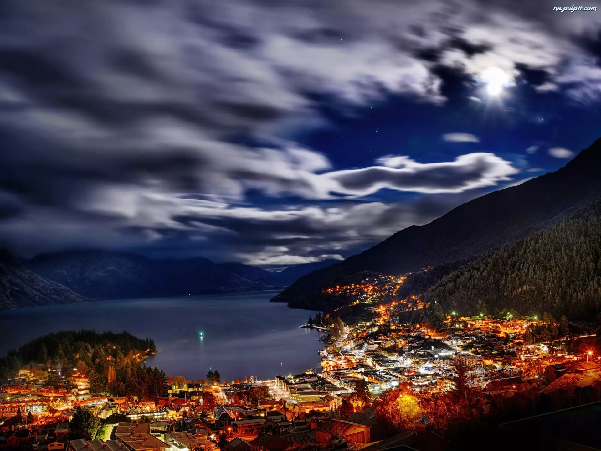 Góry, Nocą, Jezioro, Miasto