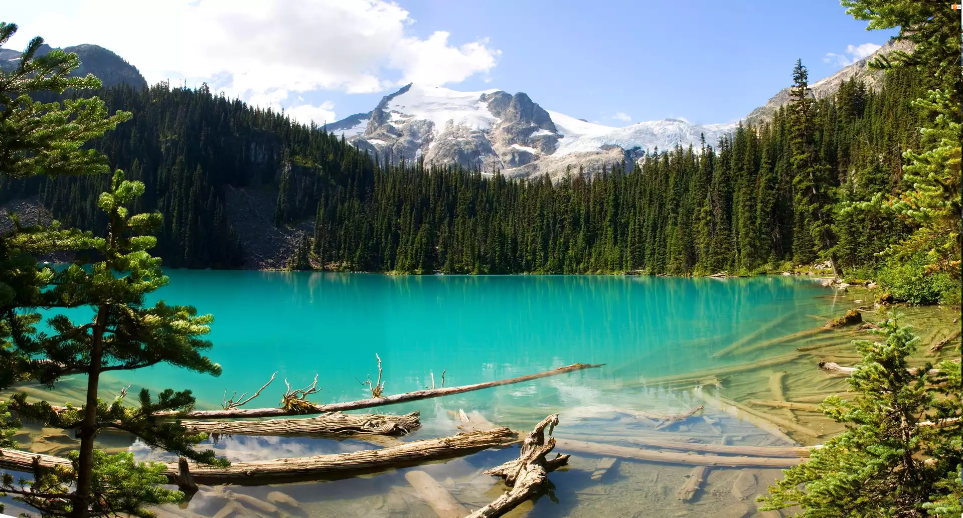 Góry, Ośnieżone szczyty, Las, Jezioro