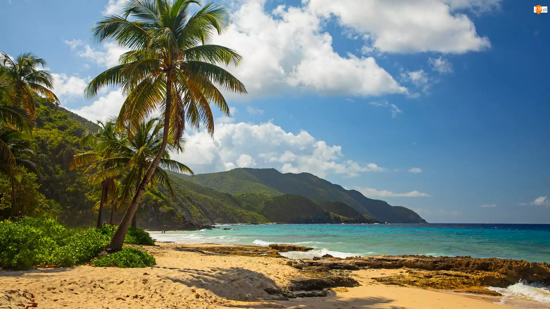 Góry, Plaża, Morze, Palmy