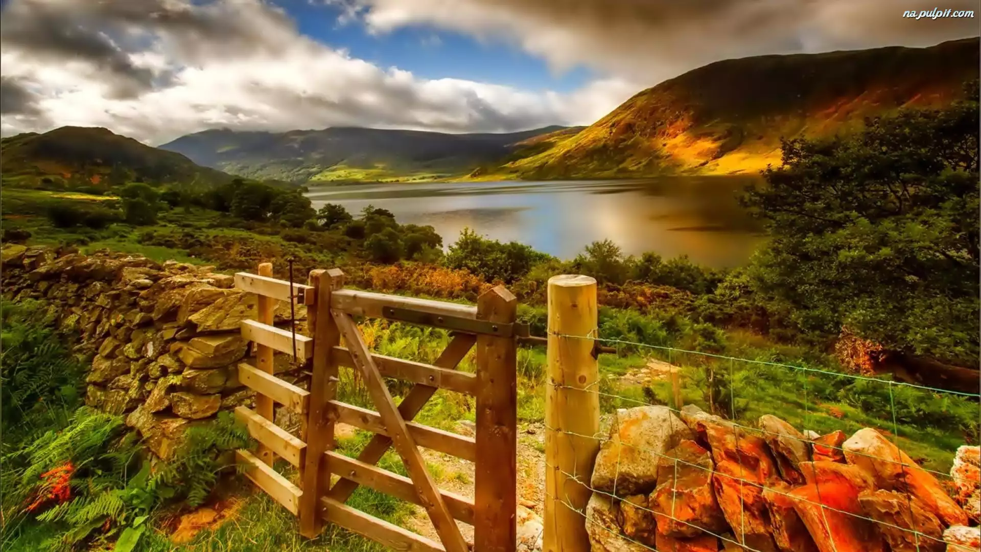 Góry, Płot, Jezioro, Chmury