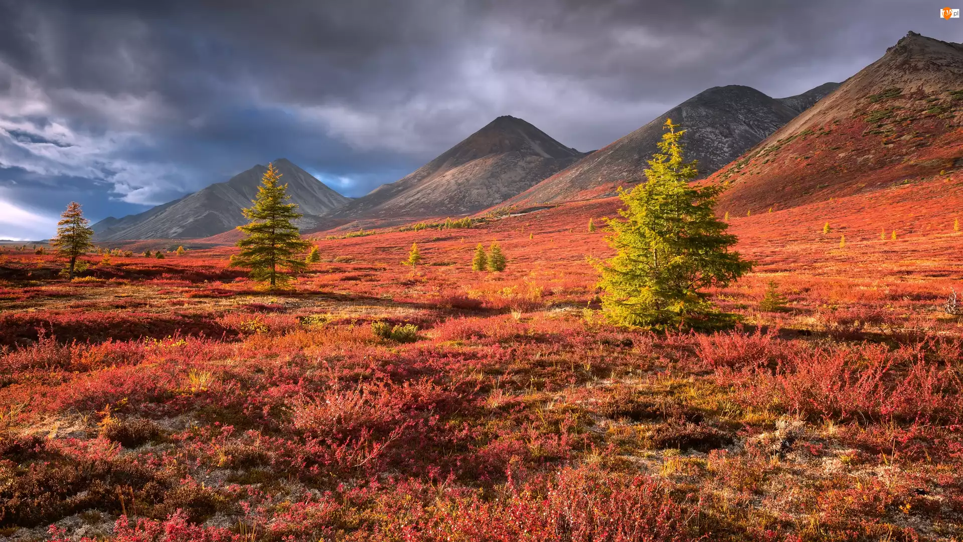 Góry, Rosja, Drzewa, Jesień, Chmury, Krzewy
