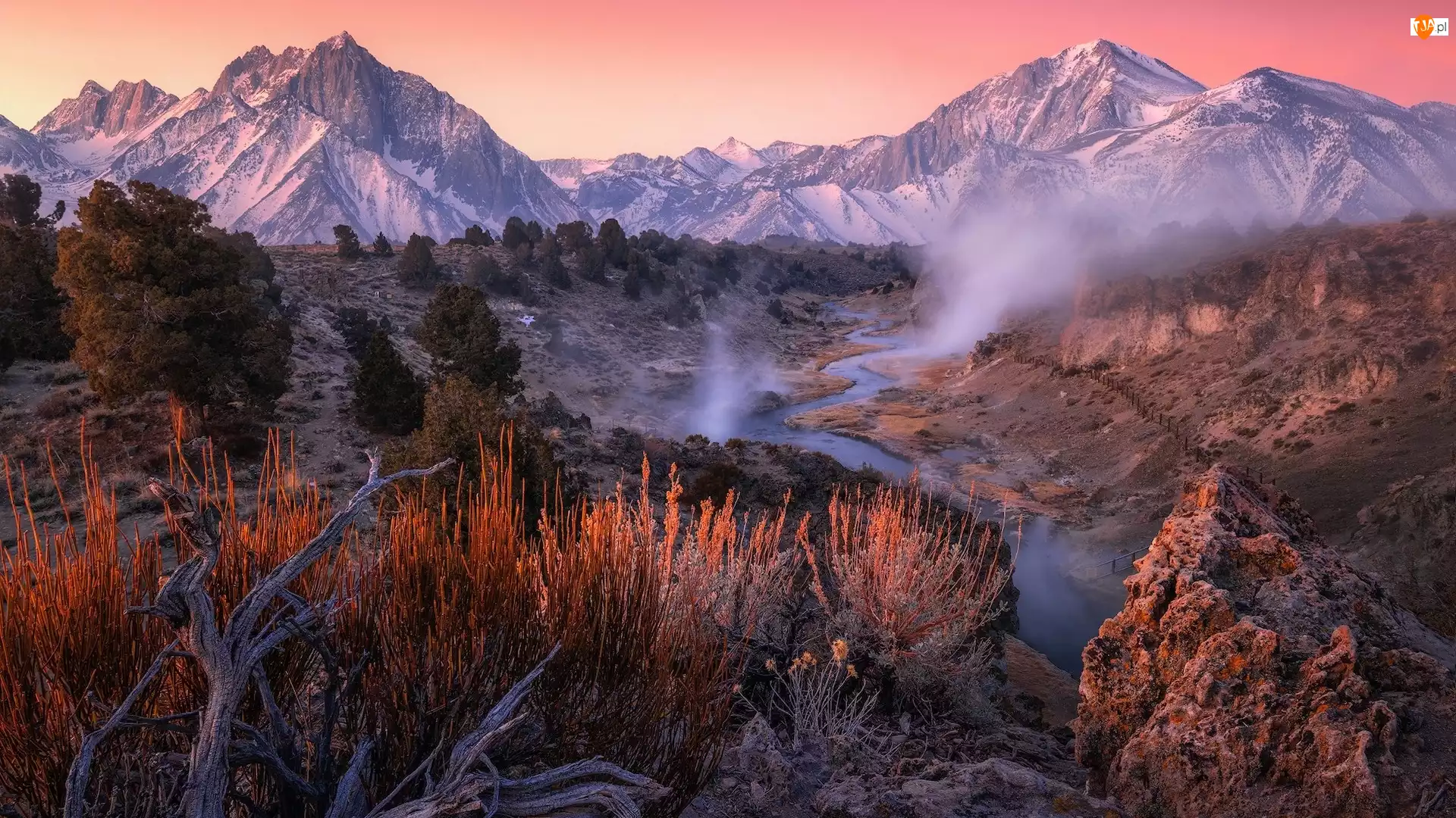 Góry, Rzeka, Skały, Ośnieżone, Roślinność,