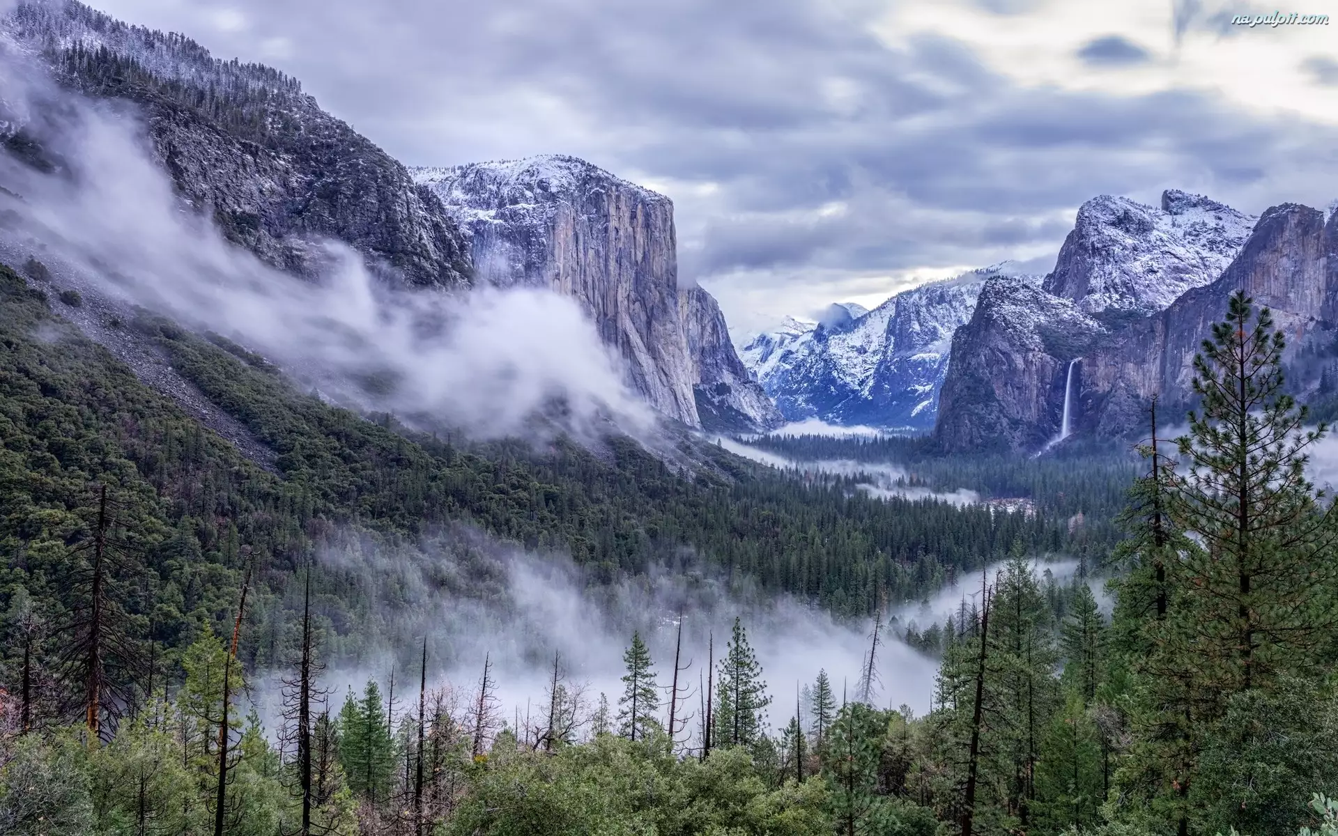 Lasy, Stany Zjednoczone, Góry, Drzewa, Kalifornia, Wodospad, Mgła, Park Narodowy Yosemite
