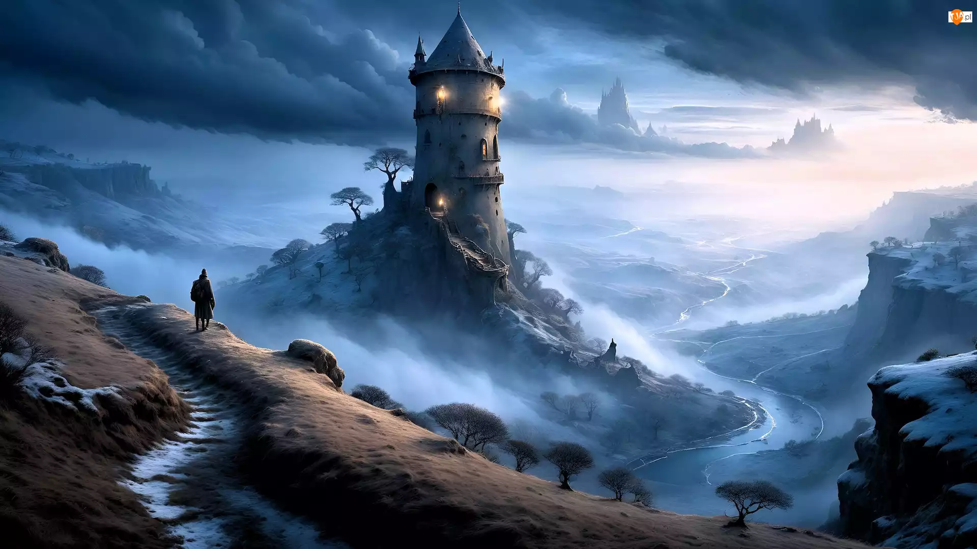 Góry, Skała, Mgła, Grafika, Droga, Człowiek, Wieża