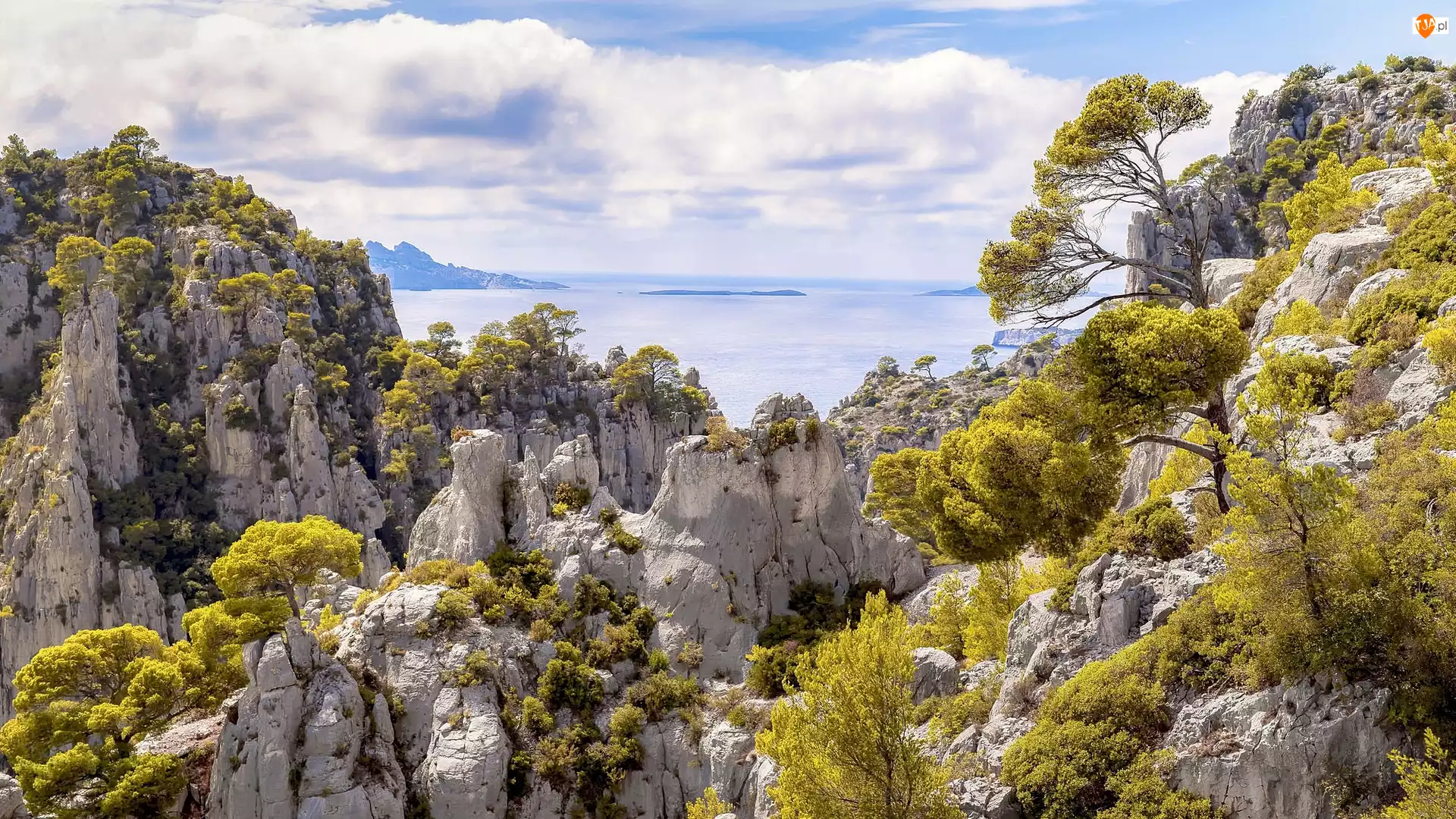 Morze, Krajobraz, Skały, Góry, Drzewa