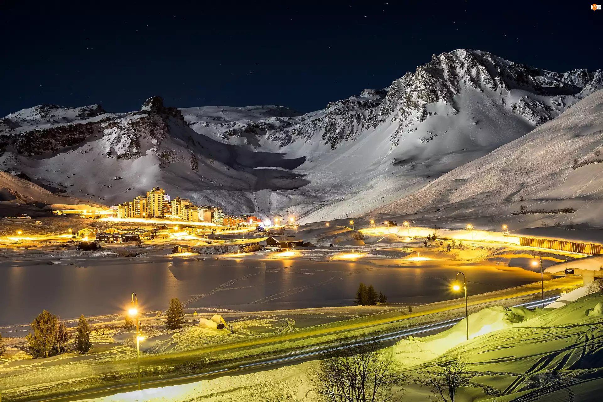 Góry, Światła, Zima, Domy