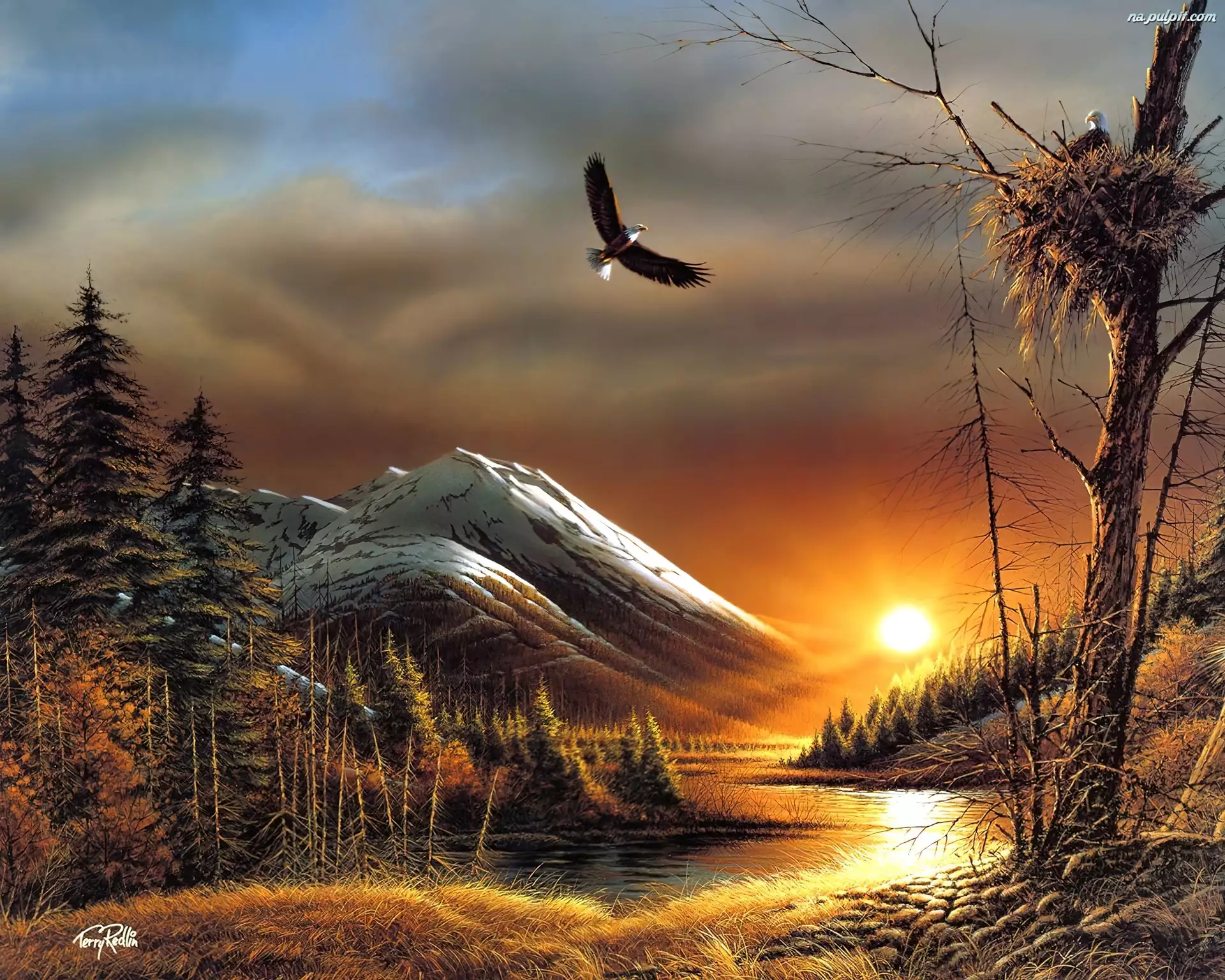 Góry, Terry Avon Redlin, Zachód słońca, Ptaki