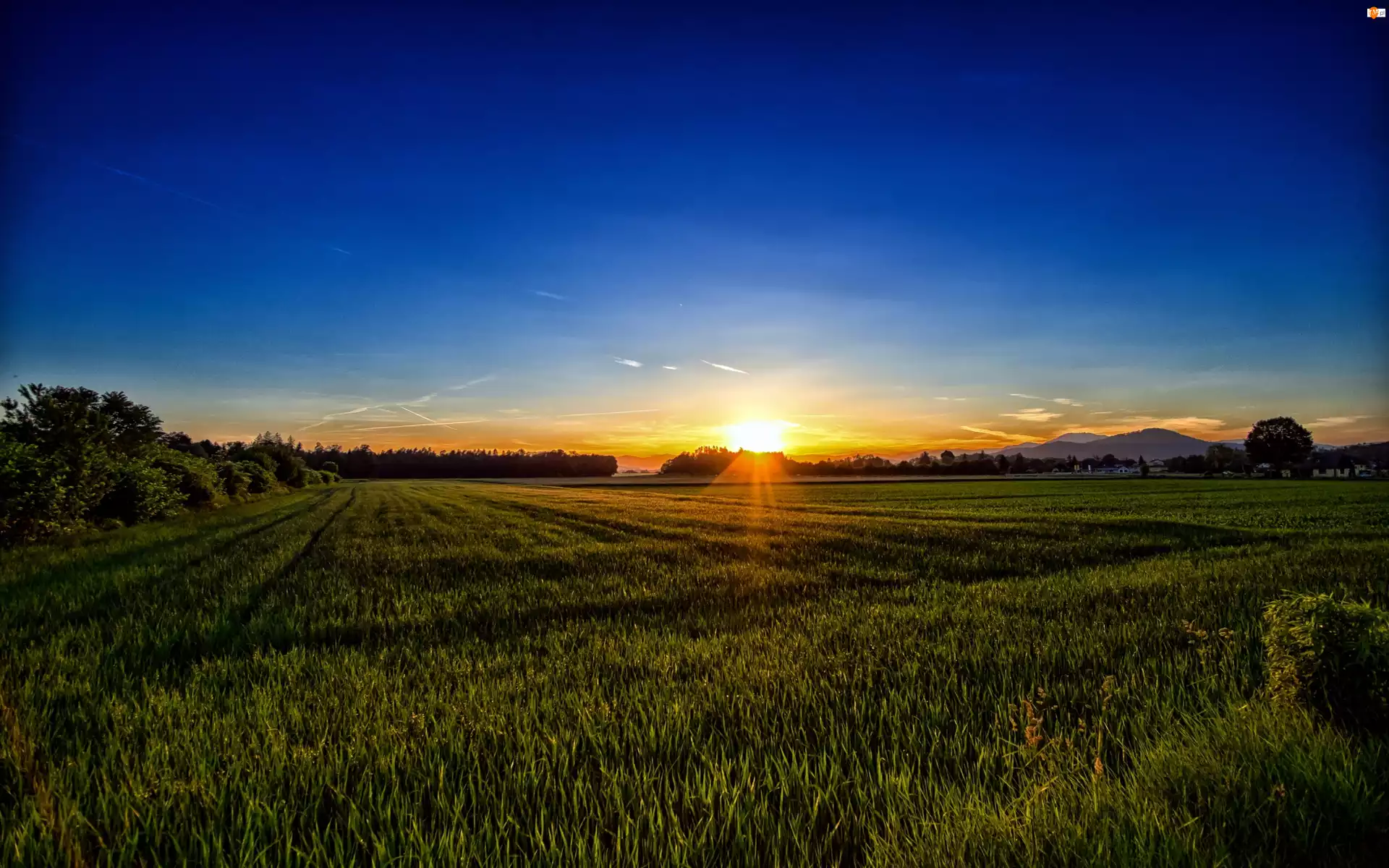 Góry, Wschód Słońca, Pole, Łąka, Drzewa