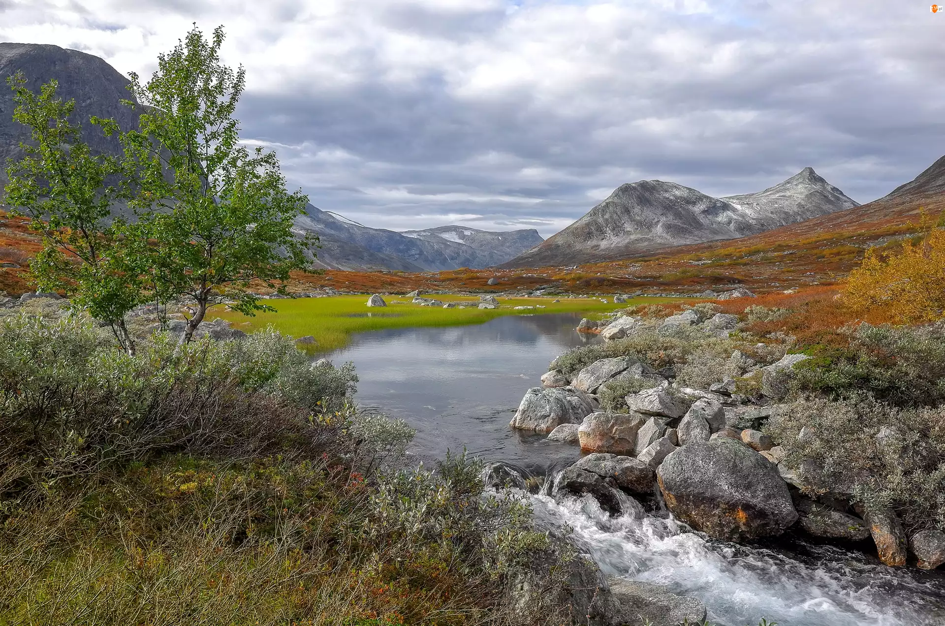 Góry, Wzgórza, Rzeczka, Kamienie, Drzewo