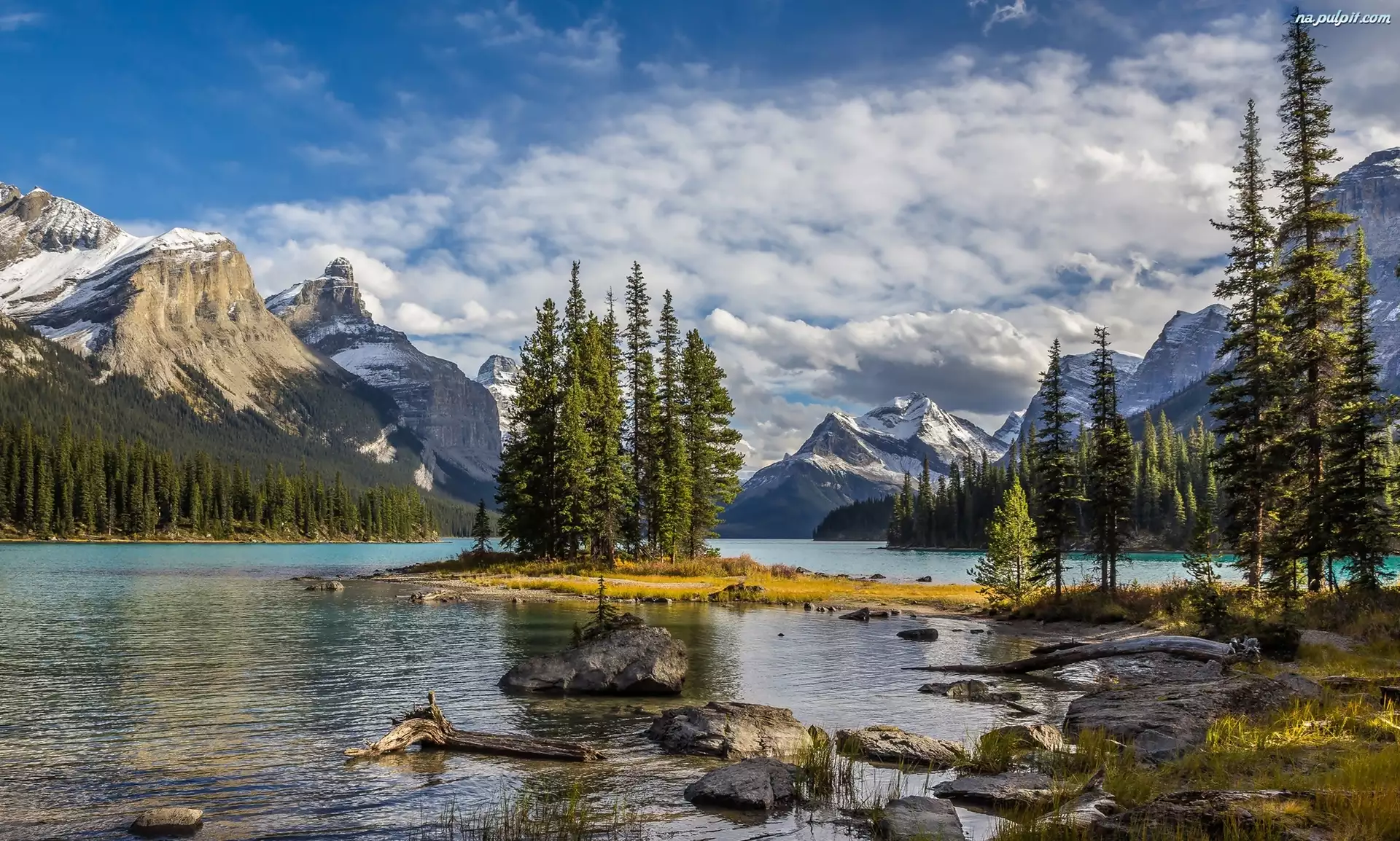Jezioro Maligne, Wyspa Ducha, Park Narodowy Jasper, Drzewa, Kanada, Kamienie, Góry, Chmury