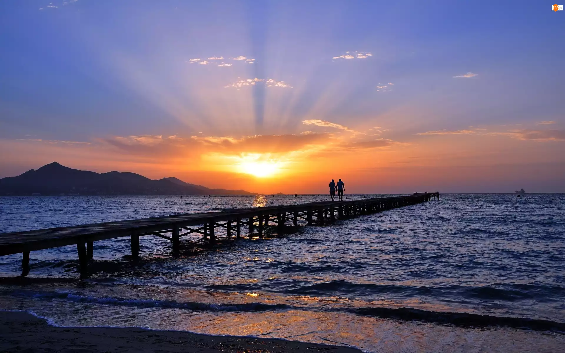 Góry, Zachód, Morze, Słońca, Pomost, Ludzie