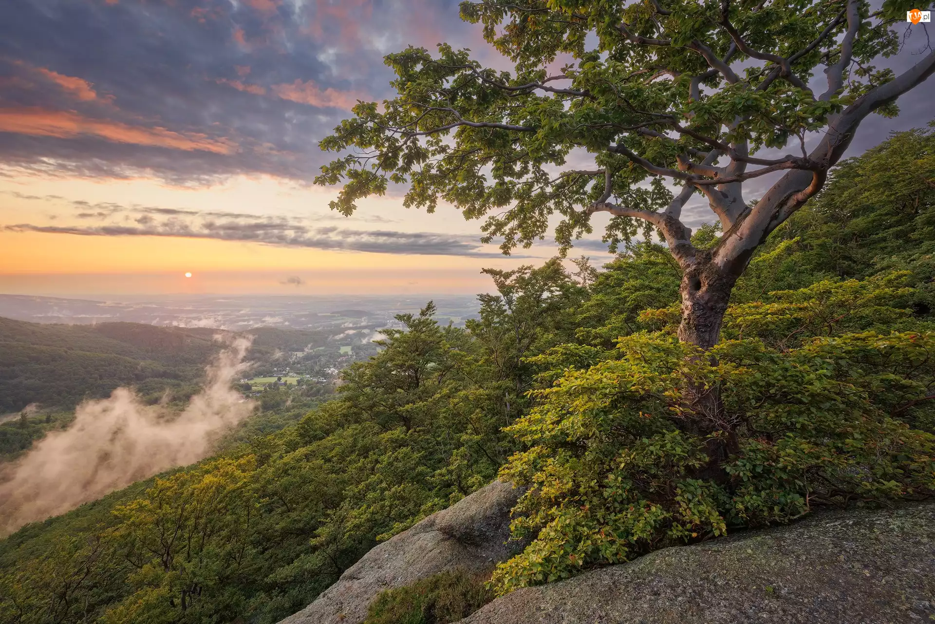 Góry, Zachód słońca, Drzewa, Chmury, Skały, K