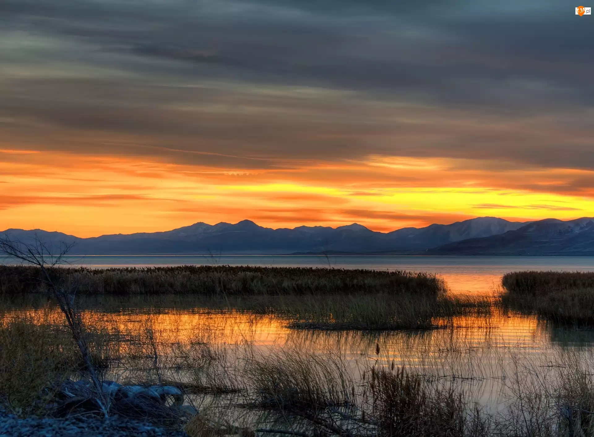 Góry, Zachód Słońca, Jezioro, Zarośla