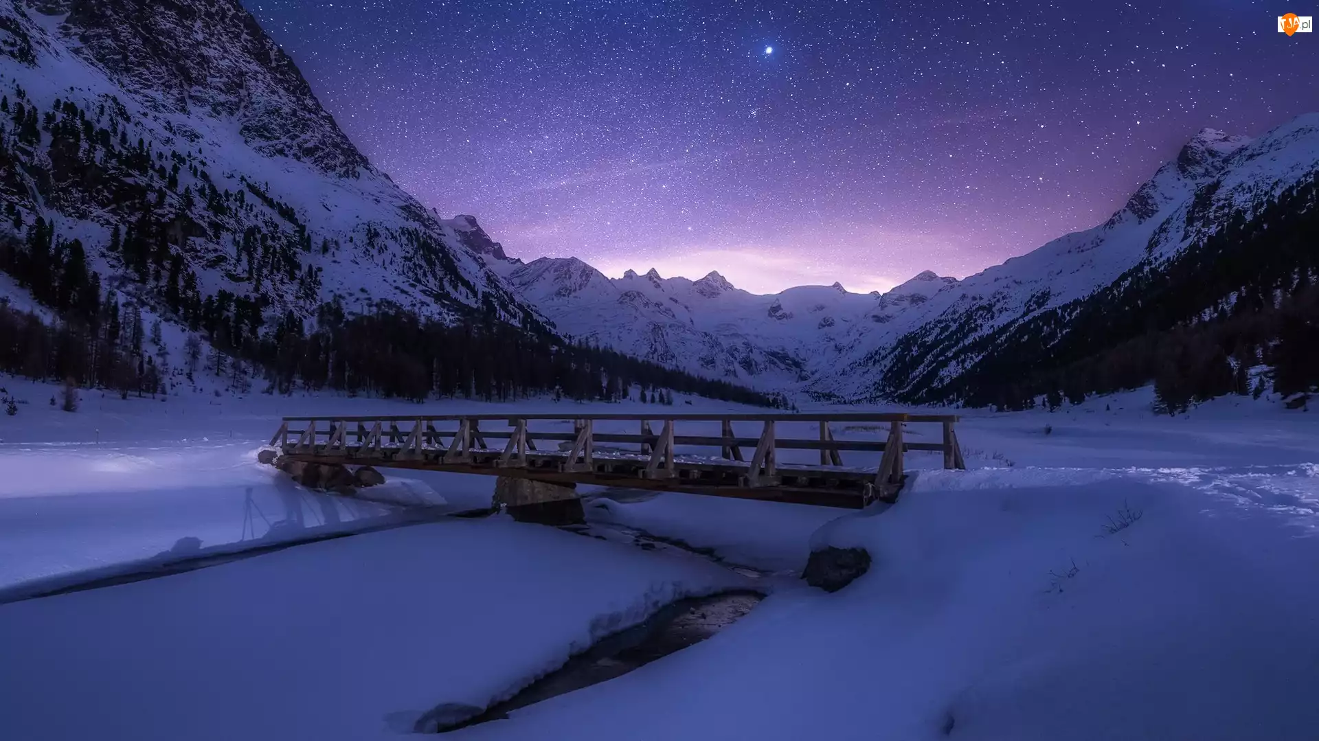 Góry, Zima, Mostek, Gwiazdy, Rzeka, Drzewa
