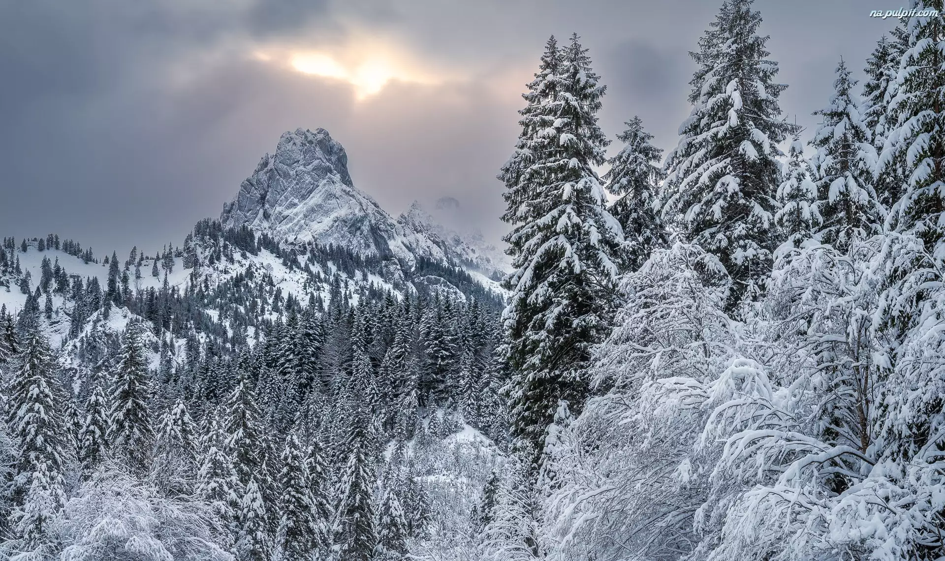 Góry, Zima, Ośnieżone, Chmury, Las, Drzewa
