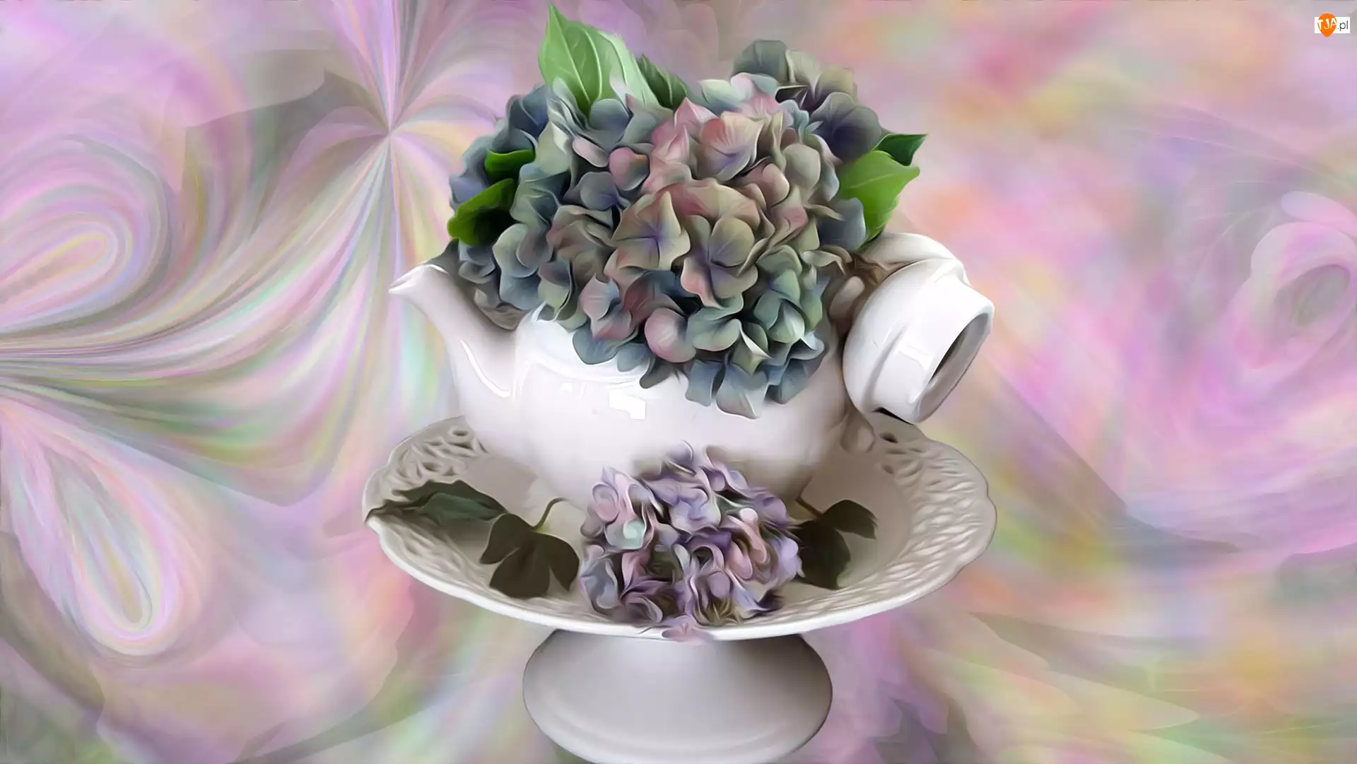 Kwiaty, Grafika, Patera, Czajniczek, Hortensja, Imbryk