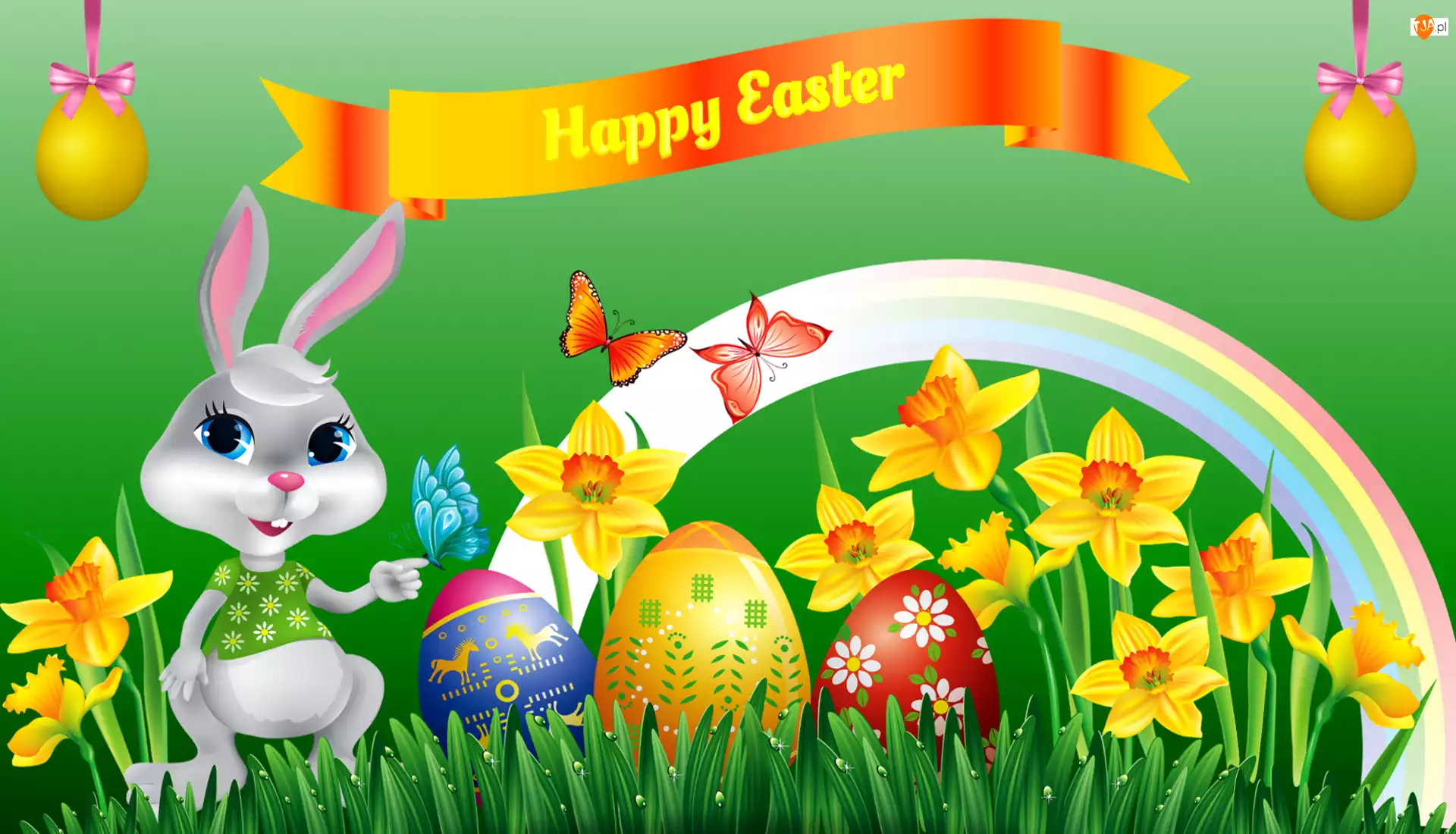 Zajączek, Pisanki, Happy Easter, Wielkanoc, Napis, Tęcza, Żonkile