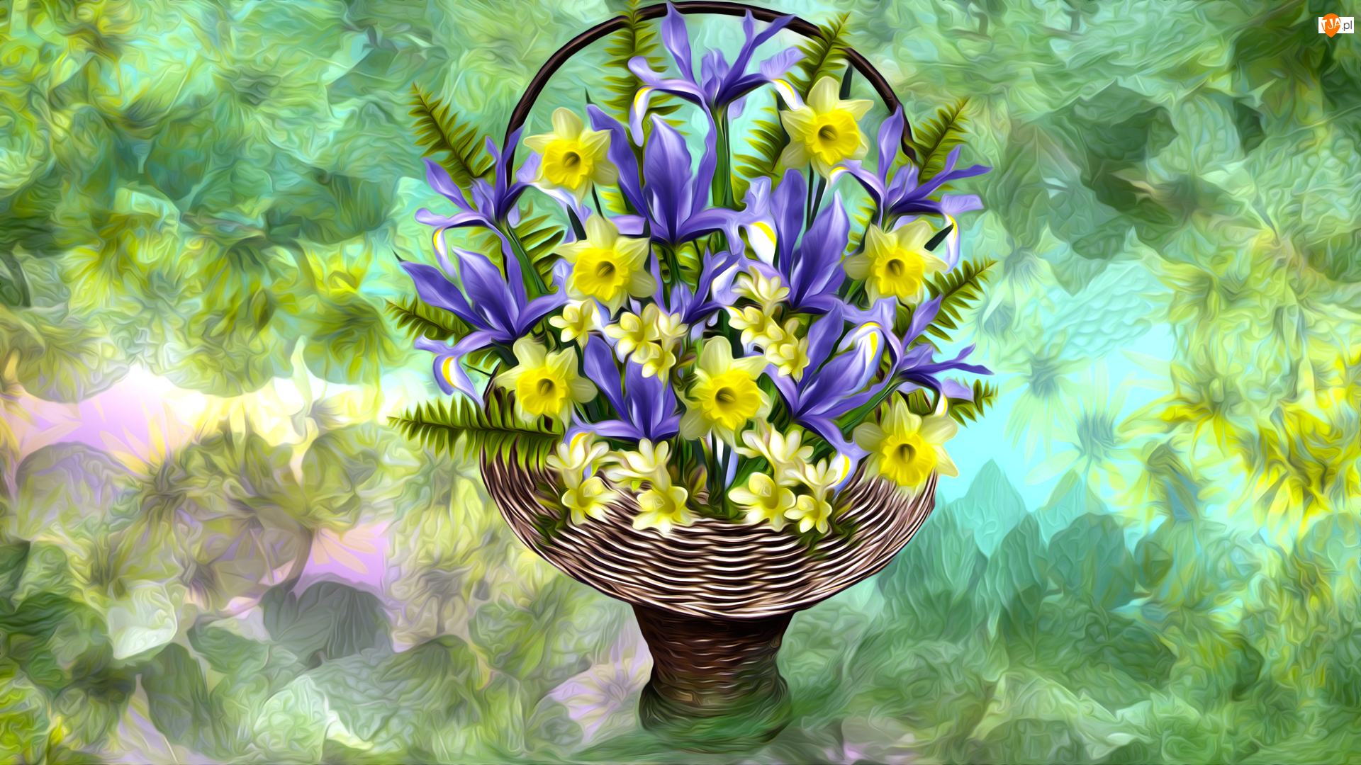 Koszyk, Narcyzy żonkile, Kwiaty, Grafika, Bukiet kwiatów