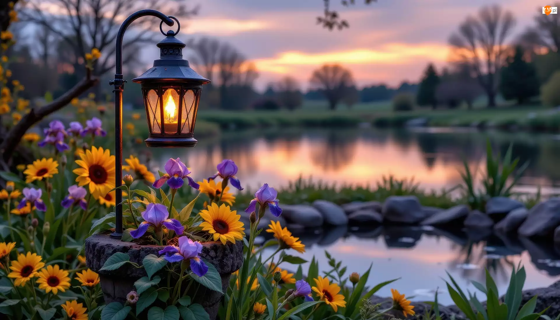 Grafika AI, Kwiaty, Latarnia, Staw