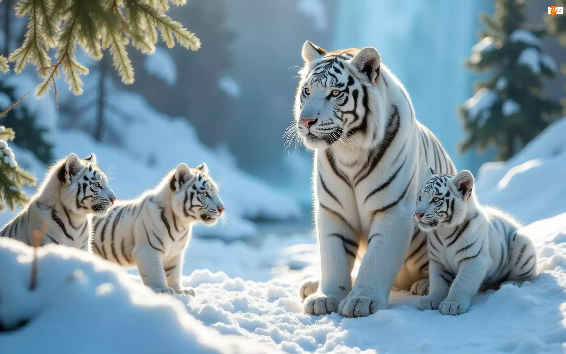 Grafika AI, Tygrysiątka, Gałązki, Trzy, Tygrysy, Białe, Śnieg, Zima, Tygrysica, Iglaste