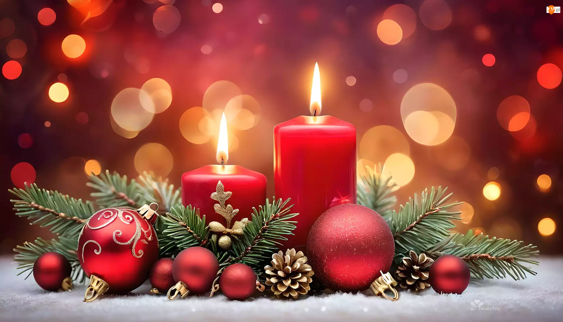 Grafika, Boże Narodzenie, Świeca, Gałązka, Stroik, Bombka, Jodła, Czerwony