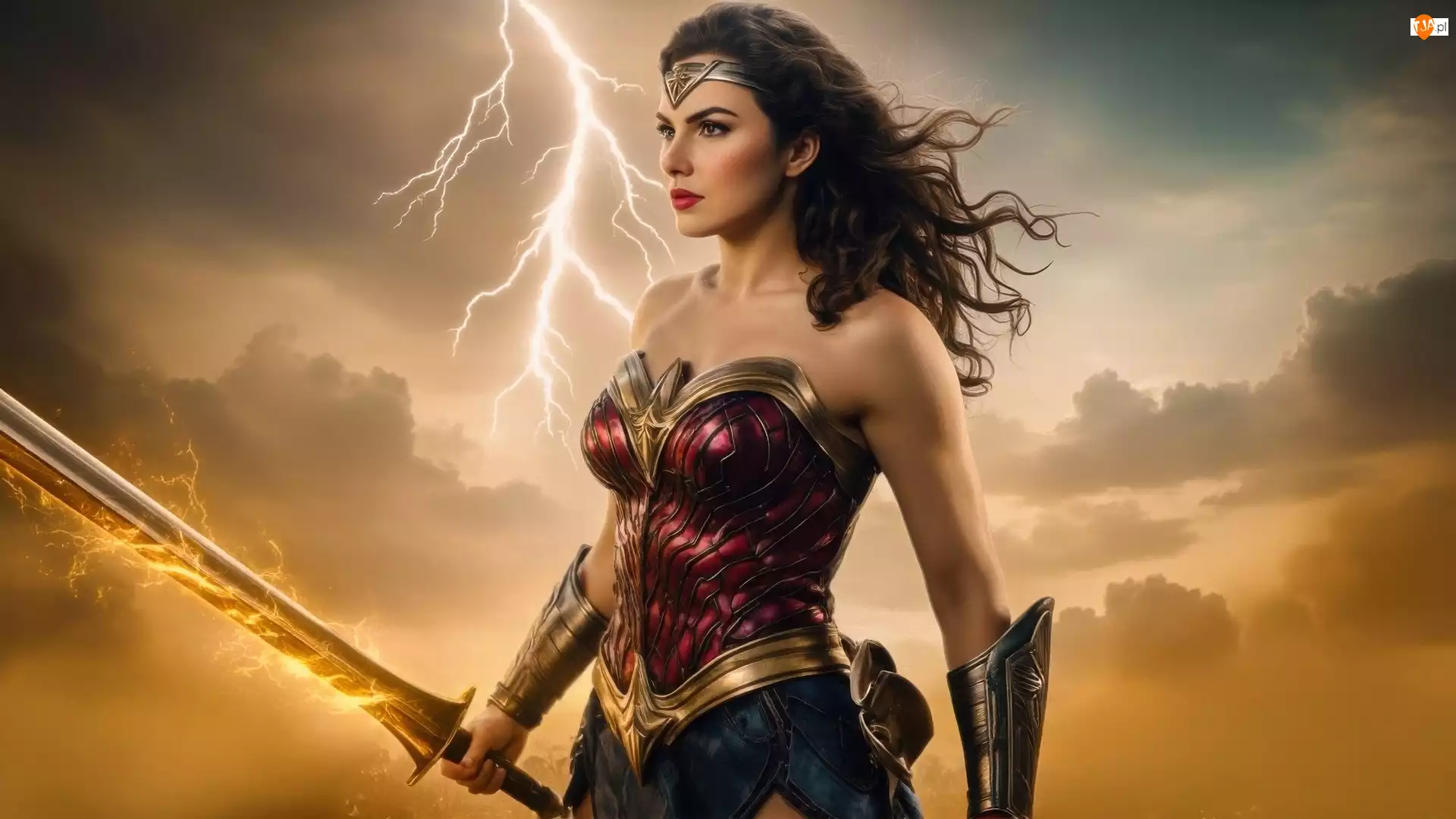 Grafika, Długie, Mgła, Miecz, Błyskawice, Włosy, Wojowniczka, Kobieta, Zbroja