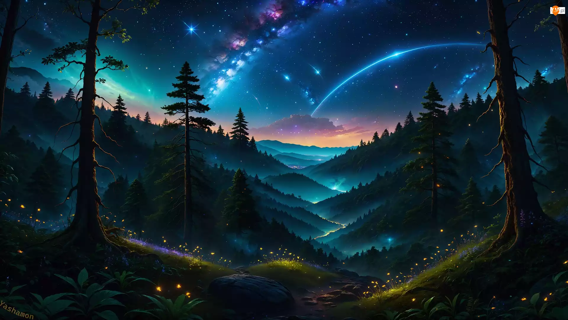 Grafika, Dolina, Droga Mleczna, Gwiazdy, Niebo, Las, Drzewa, Góry, Noc
