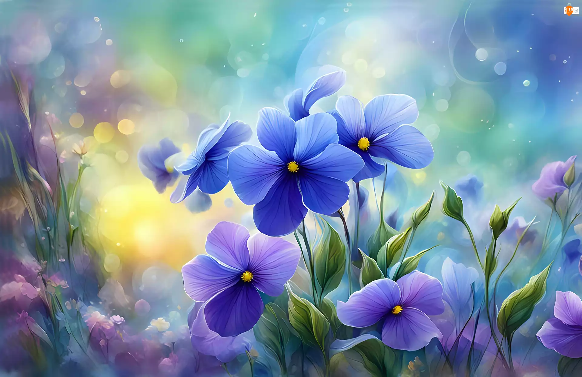 Grafika, Fioletowe, Niebieskie, Kwiaty
