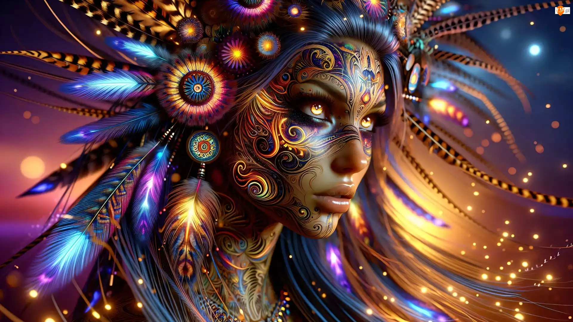 Grafika, Kobieta, Pióropusz, Tatuaże