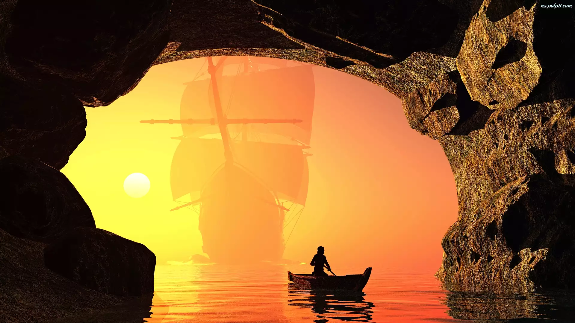 Łódka, Człowiek, Jaskinia, Żaglowiec, Zachód słońca, Mgła, Morze