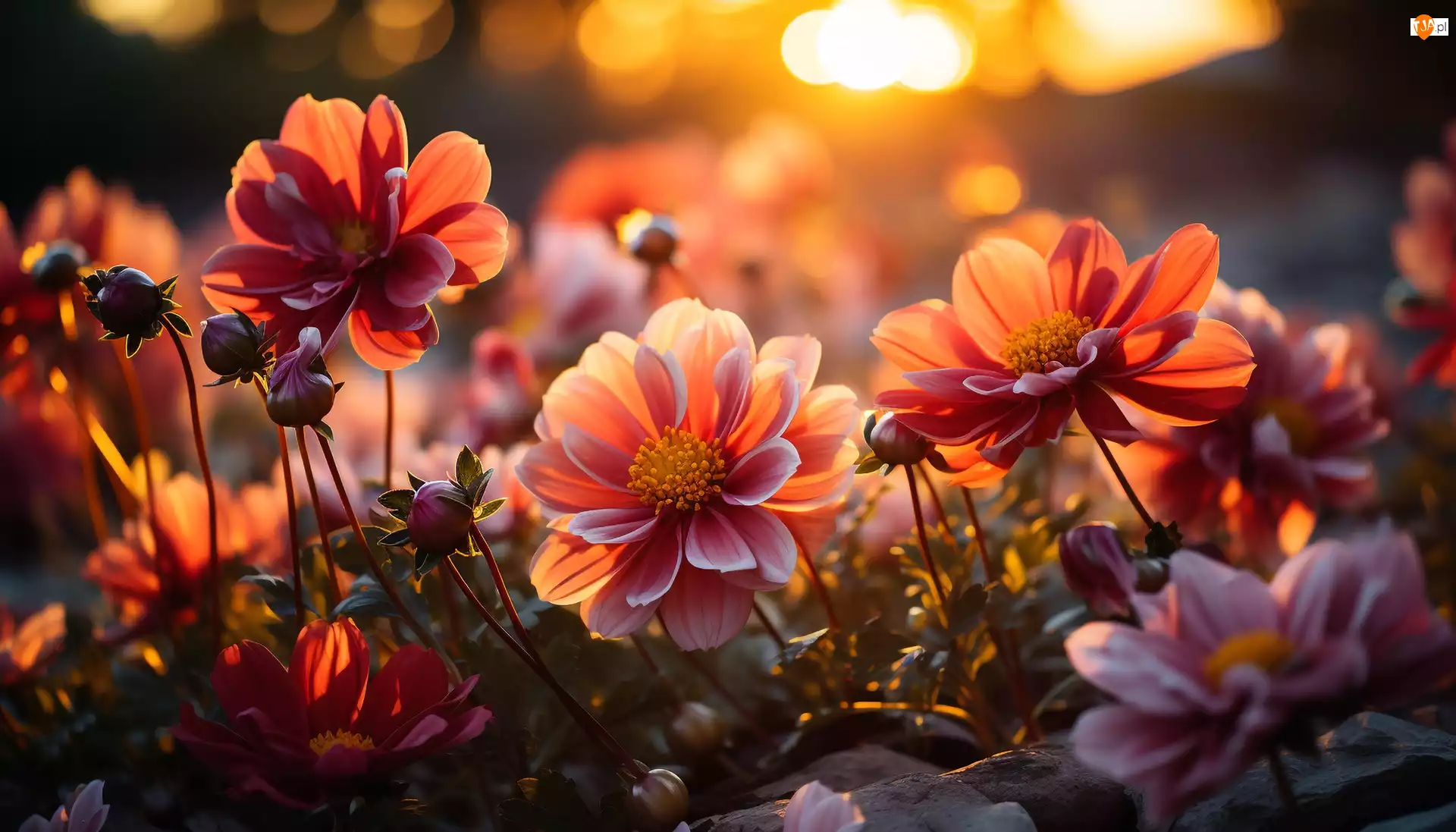 Grafika, Kwiaty, Pąki, Zachód słońca