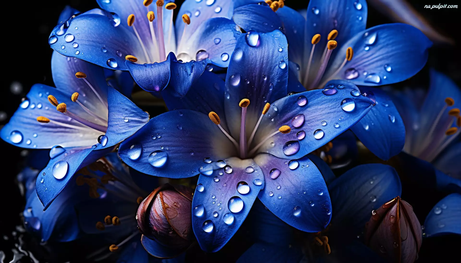 Grafika, Niebieskie, Kwiaty, Krople
