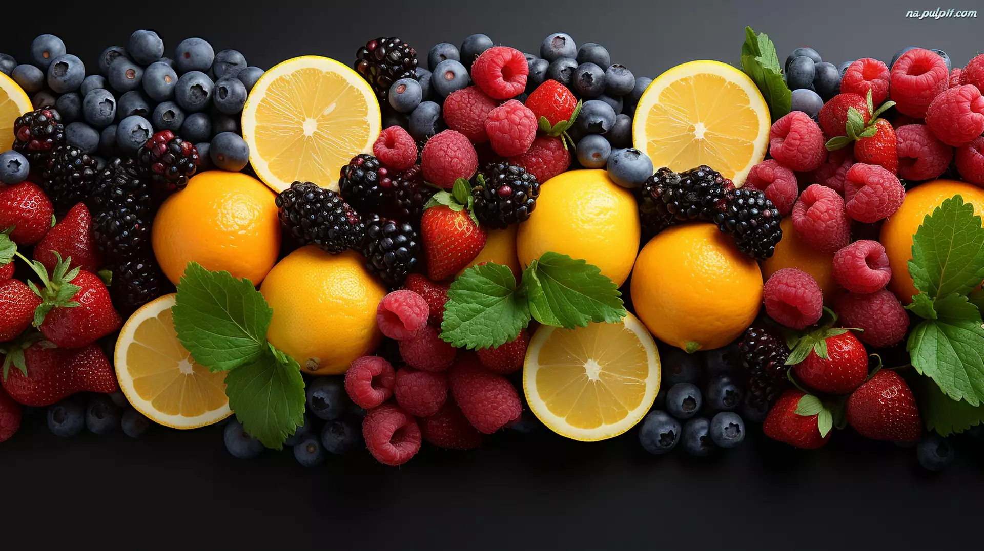 Grafika, Pomarańcze, Mięty, Maliny, Listki, Jagody, Jeżyny, Owoce, Truskawki