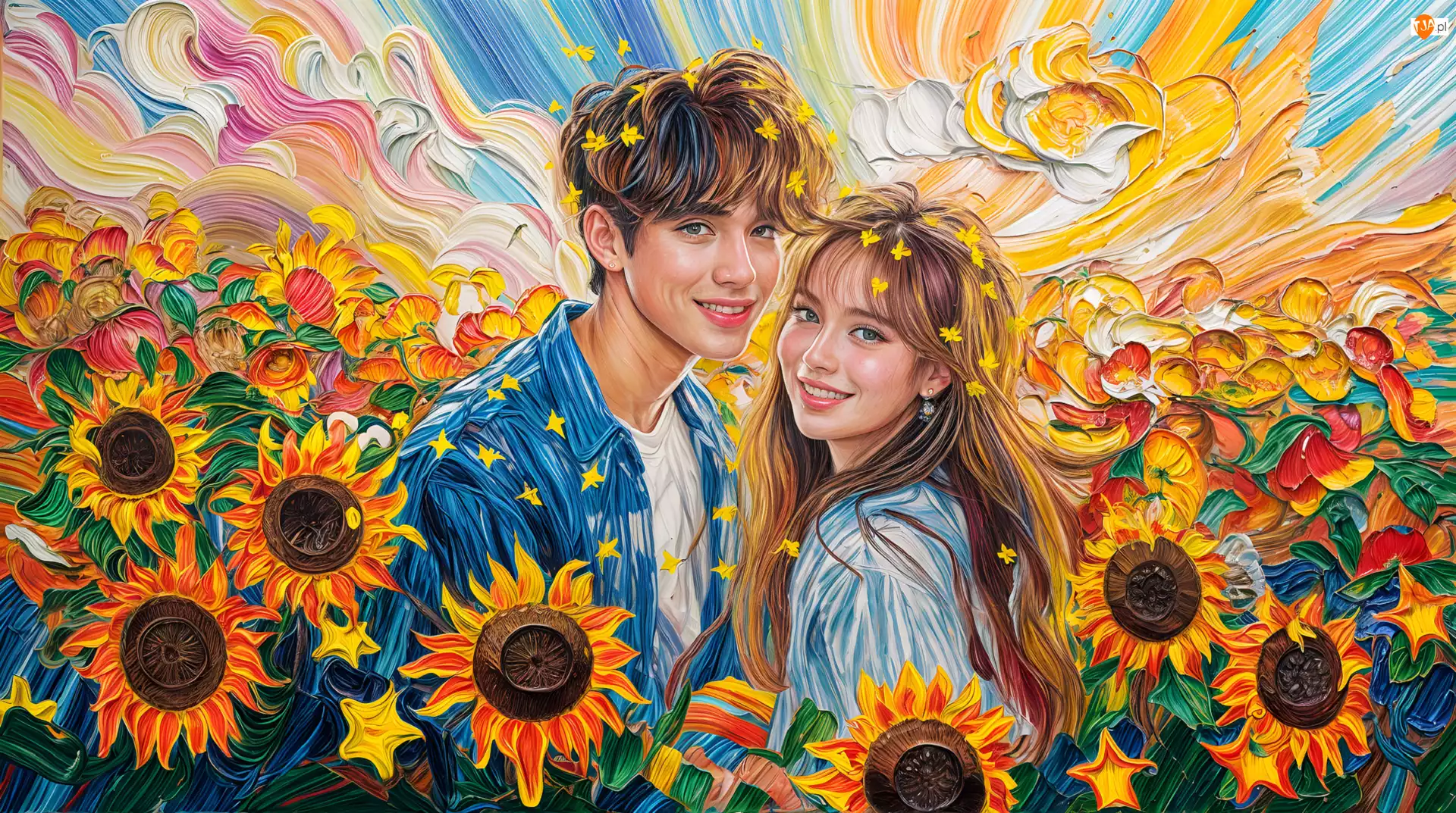 Grafika, Chłopak, Dziewczyna, Słoneczniki