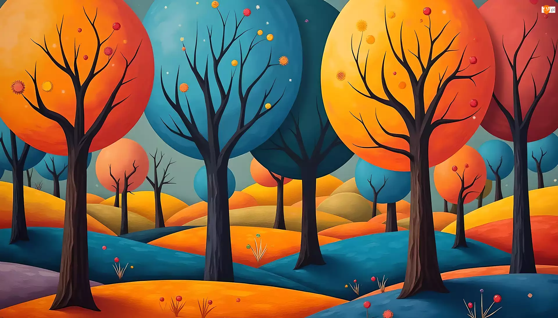 Drzewa, Grafika, Butelki, Domy, Dynie