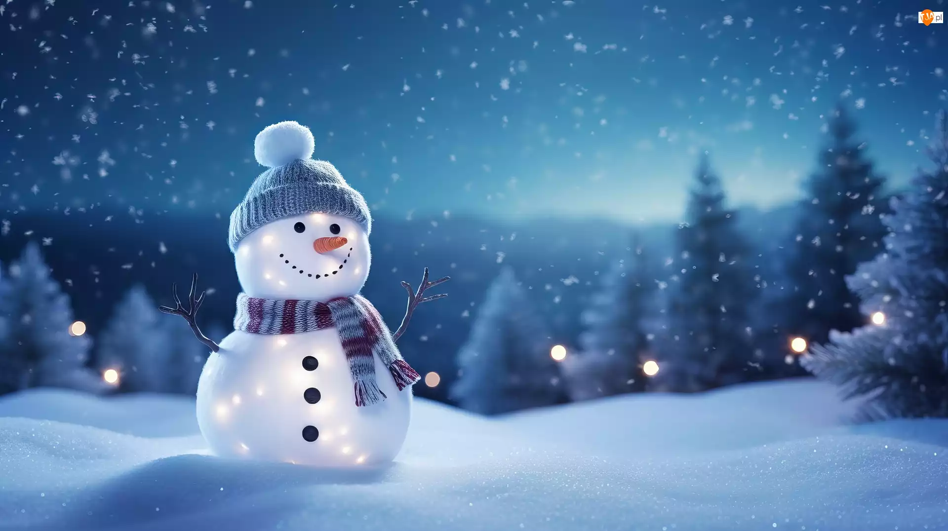 Grafika, Zima, Bałwan, Światełka