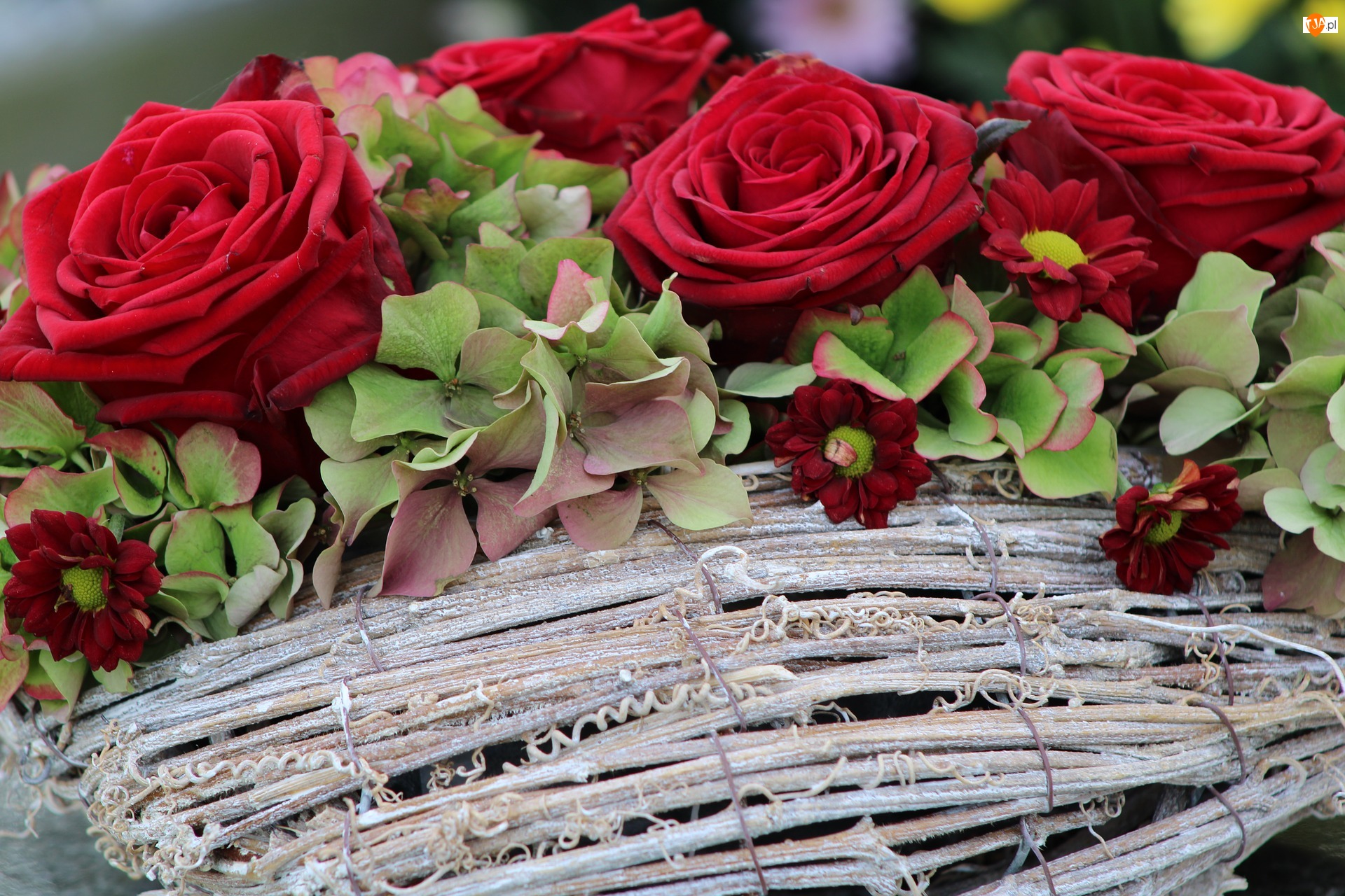 Róże, Koszyk, Czerwone, Kwiaty, Hortensje