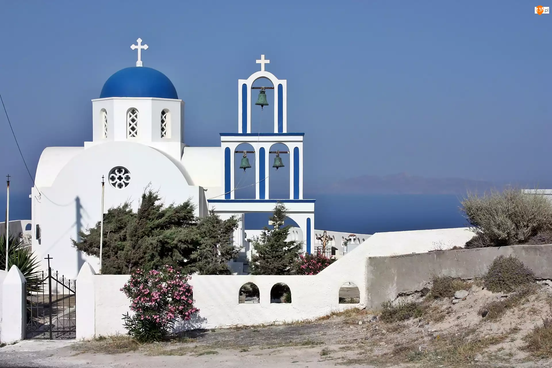 Grecja, Santorini, Morze, Cerkiew, Roślinność