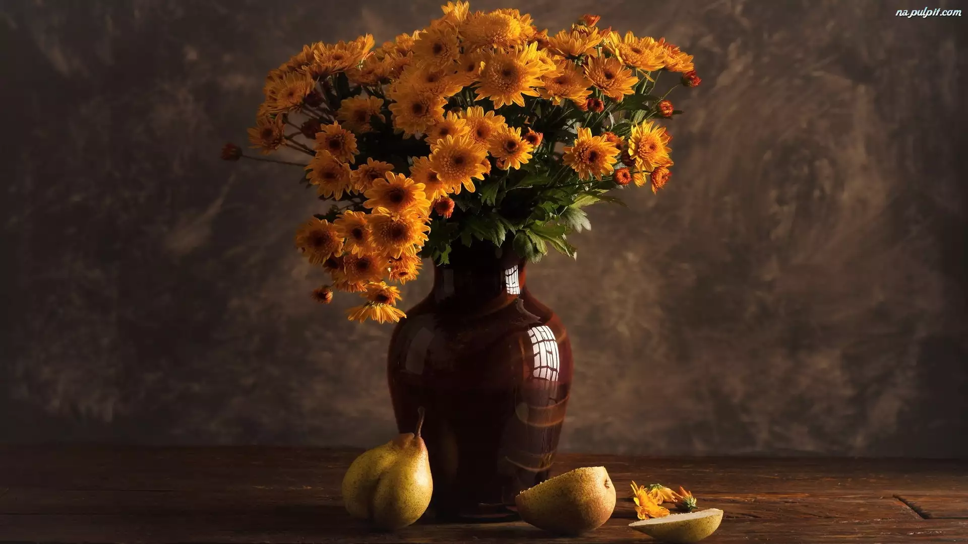 Gruszki położone obok wazonu z bukietem chryzant
