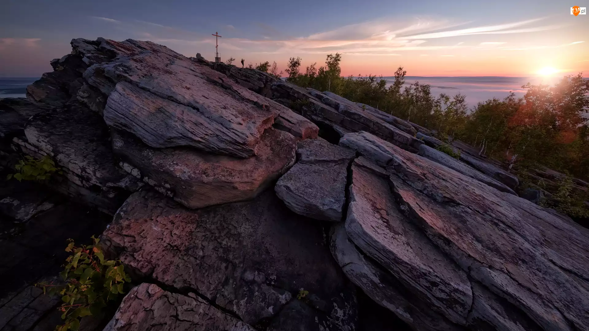 Gubacha, Góra, Krzyż, Kraj permski, Krestovaya, Wschód słońca, Rosja, Skały