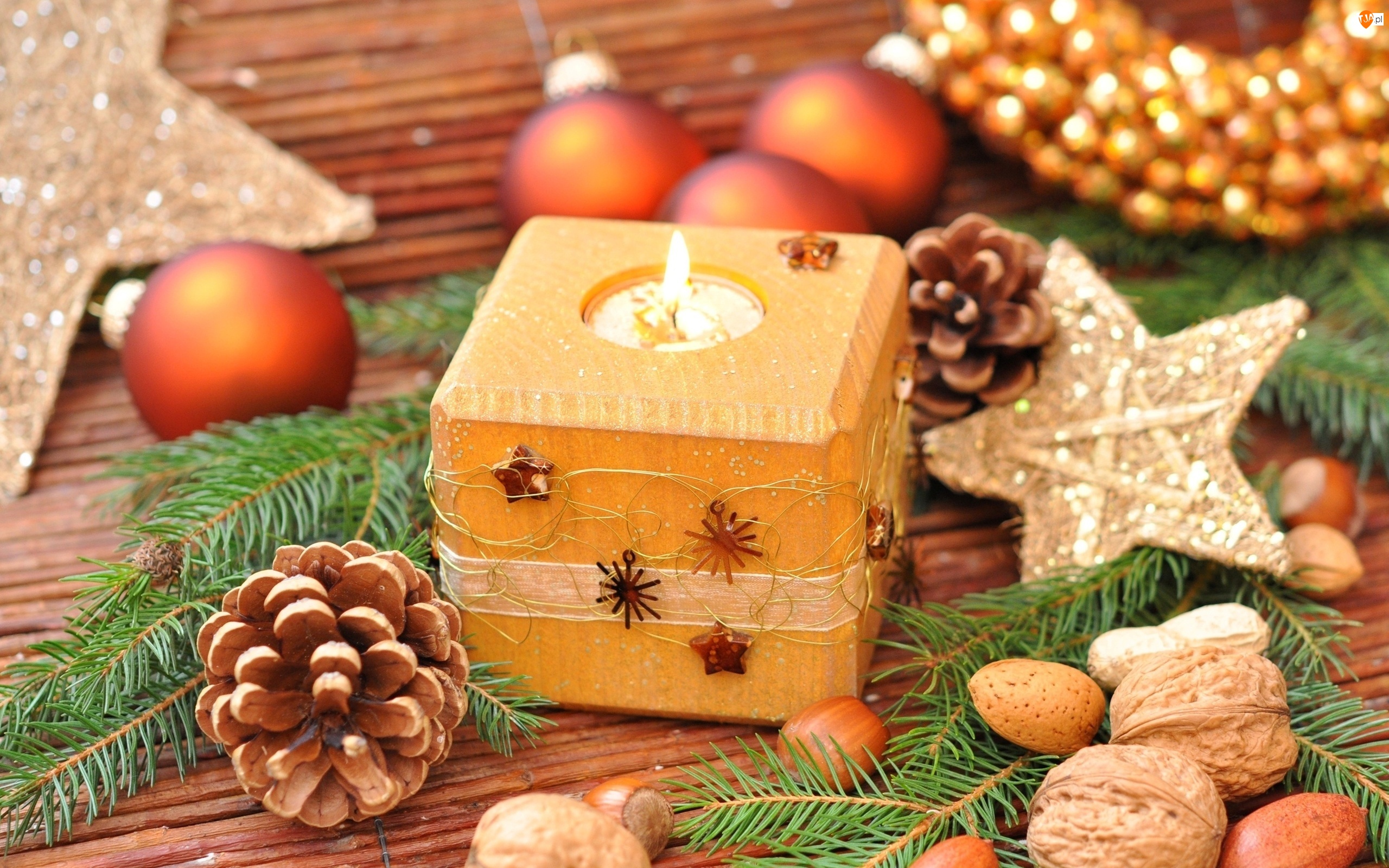 Gwiazdki, Świąteczna, Świeca, Kompozycja, Bombki, Szyszki