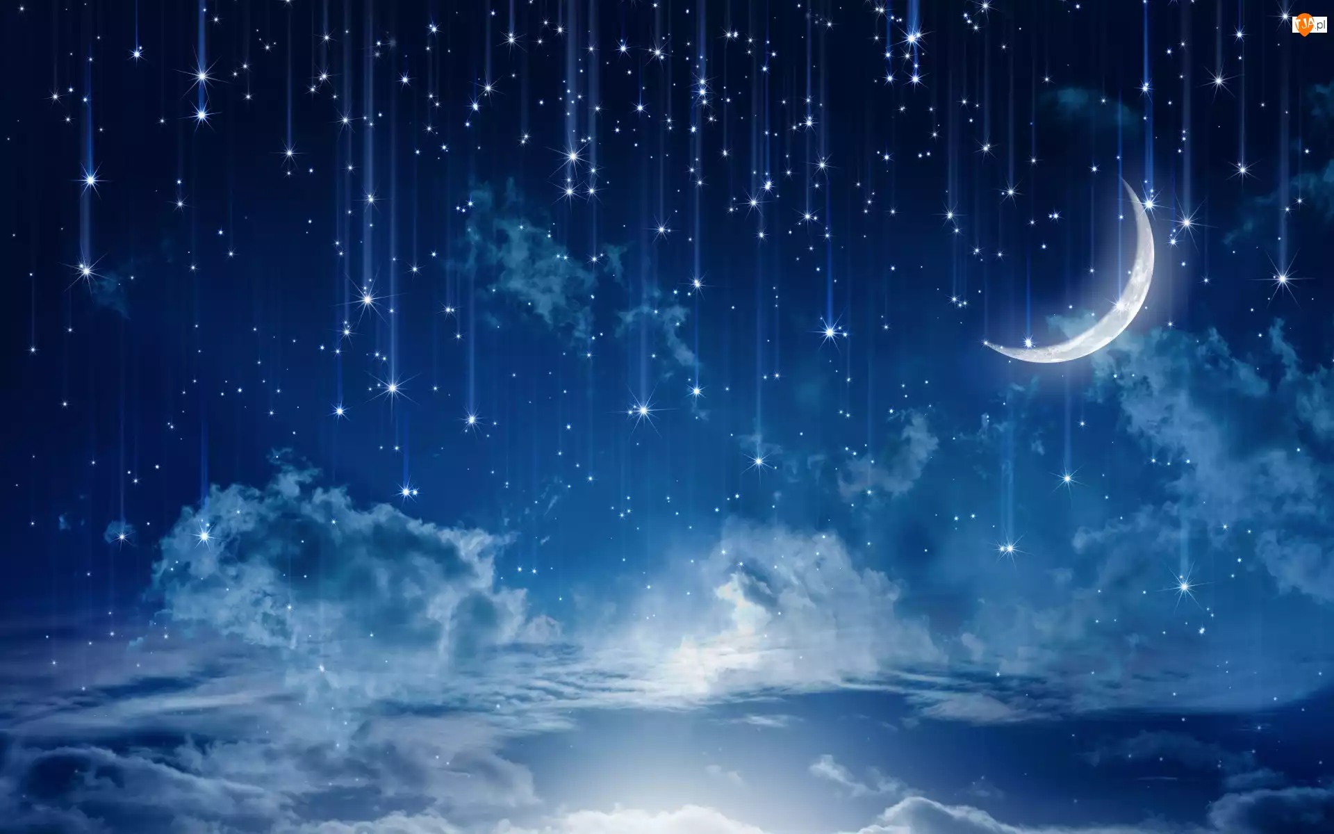 Gwiazdy, Grafika, Chmury, Noc, Księżyc