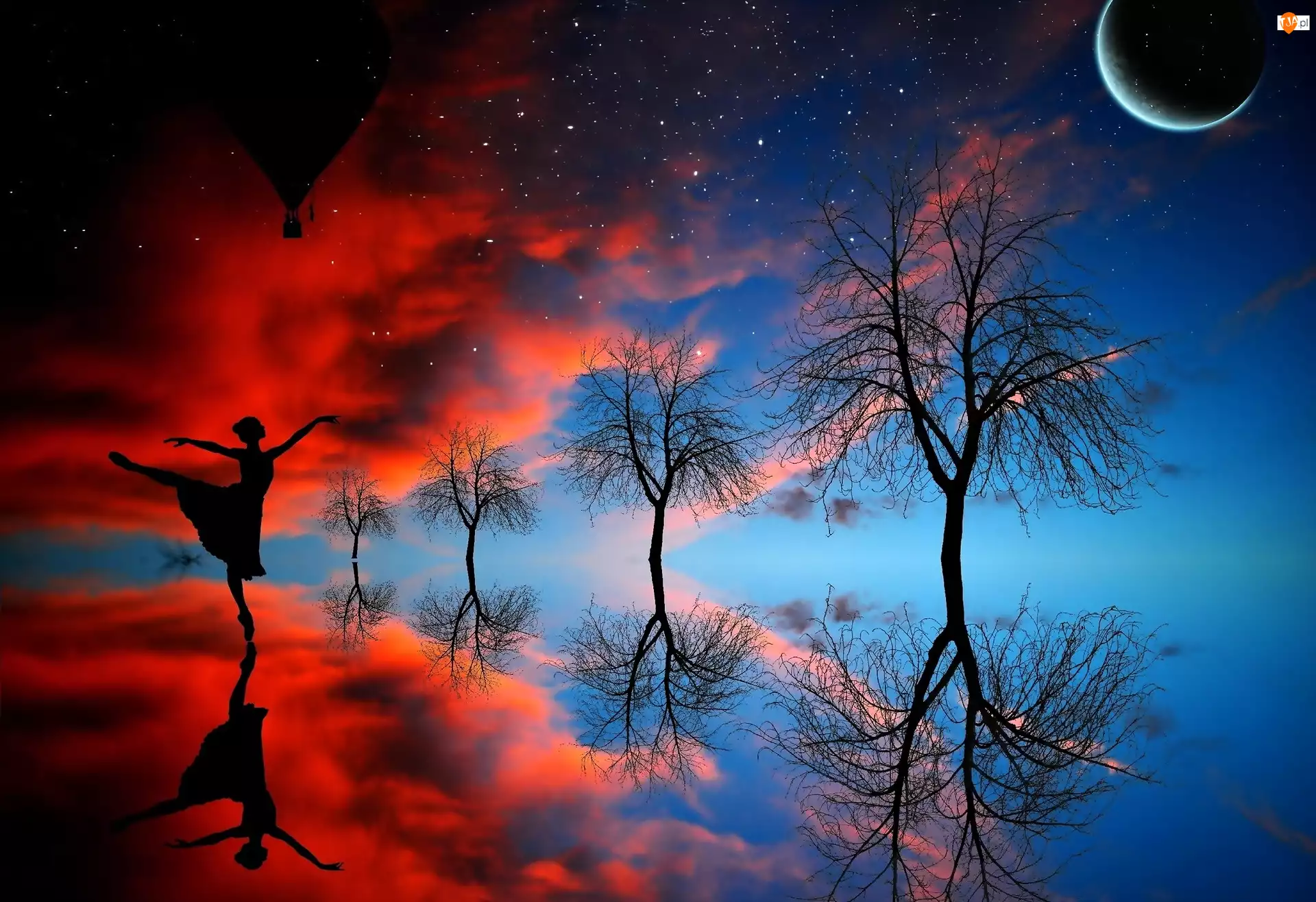 Gwiazdy, Kobieta, Drzewa, Taniec, Księżyc
