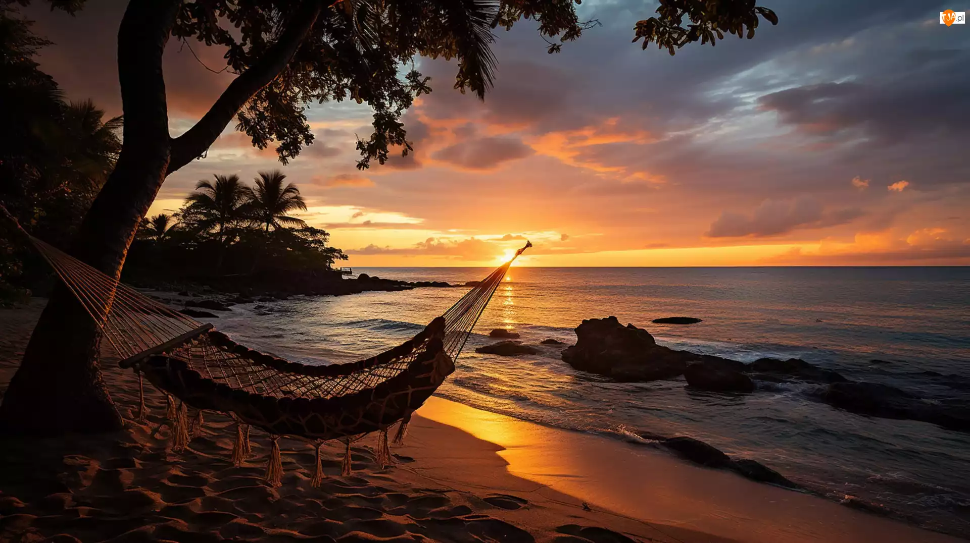 Drzewo, Plaża, Zachód słońca, Morze, Hamak