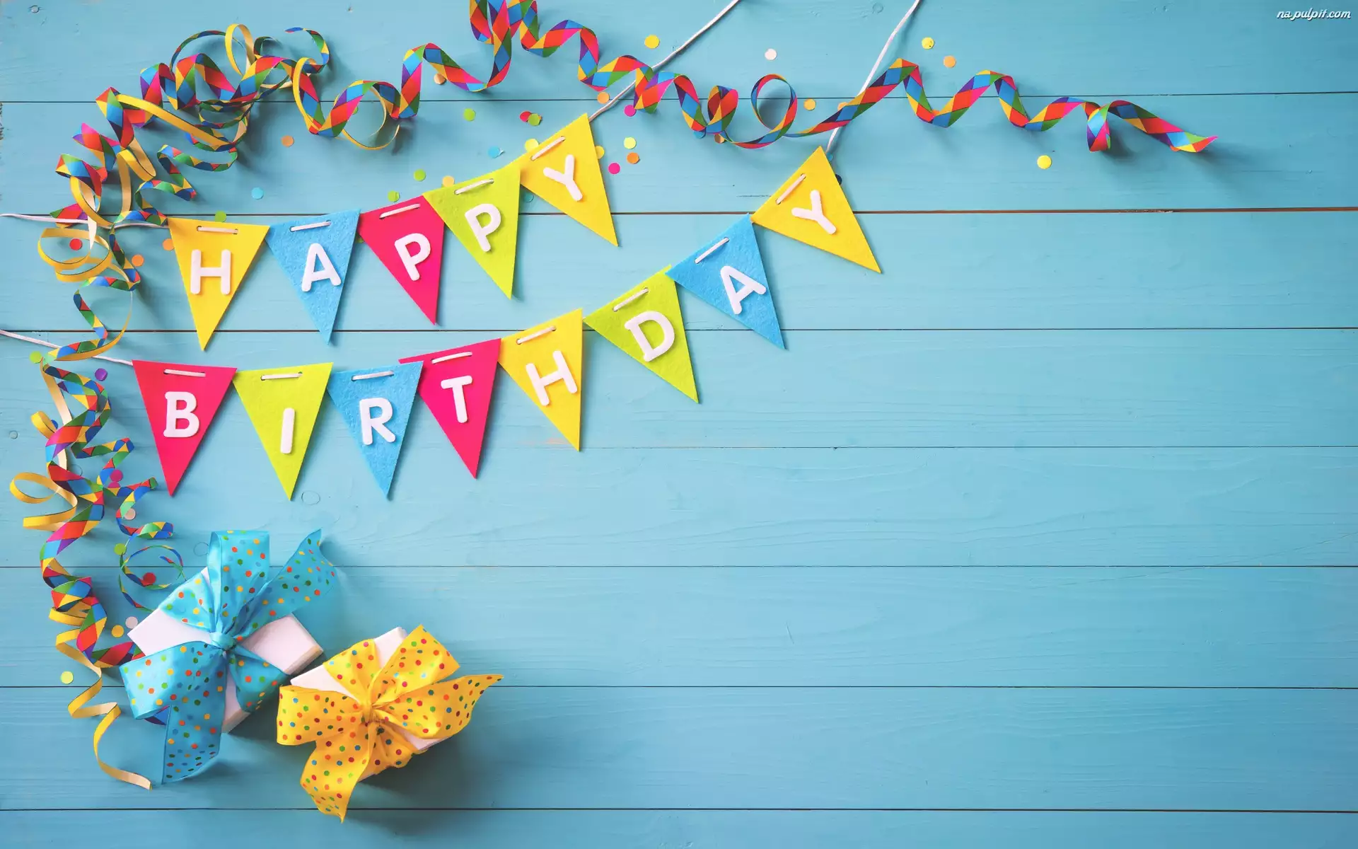 Happy Birthda z serpentynami i prezentami
