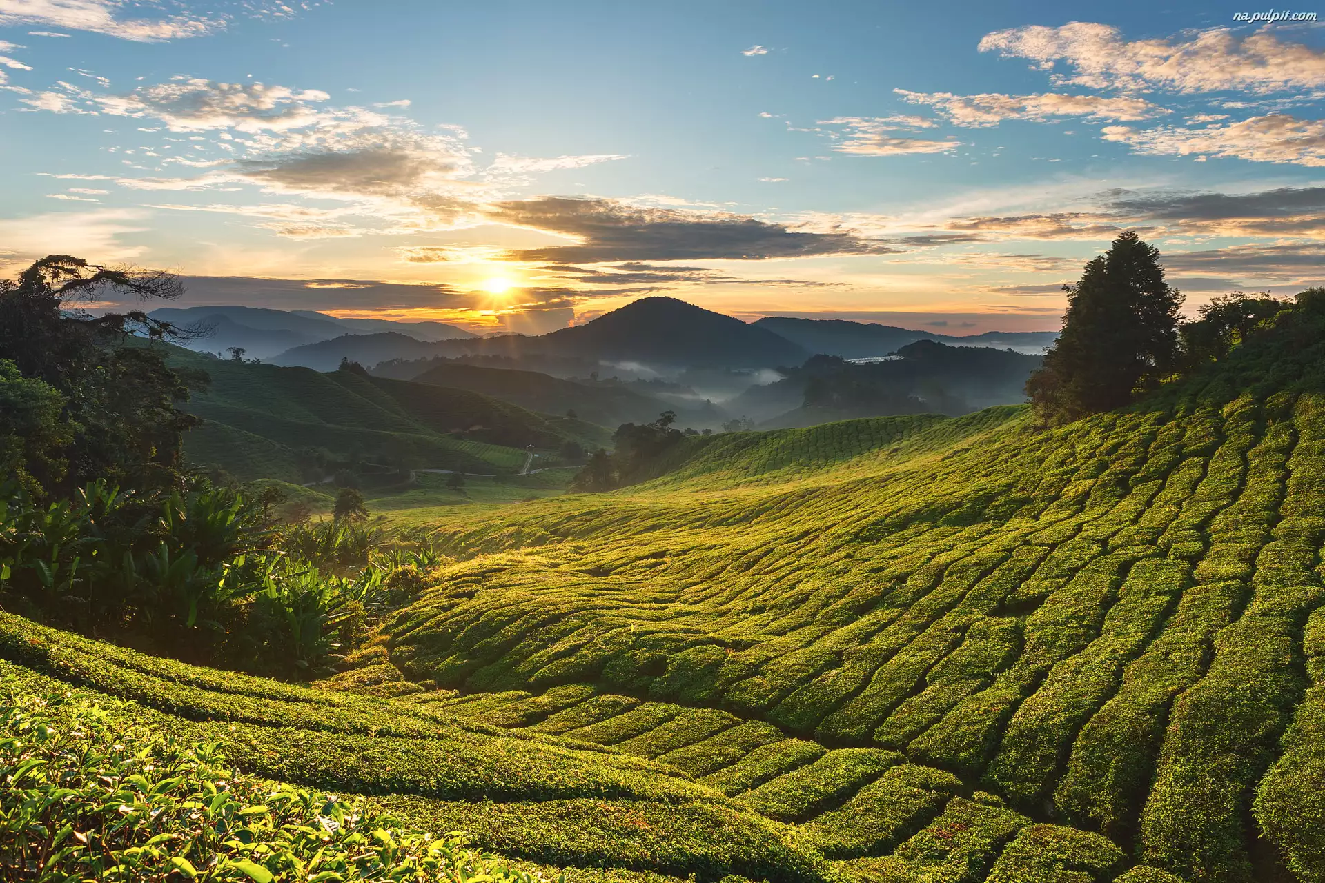 Drzewa, Plantacja, Cameron Highlands, Malezja, Wschód słońca, Stan Pahang