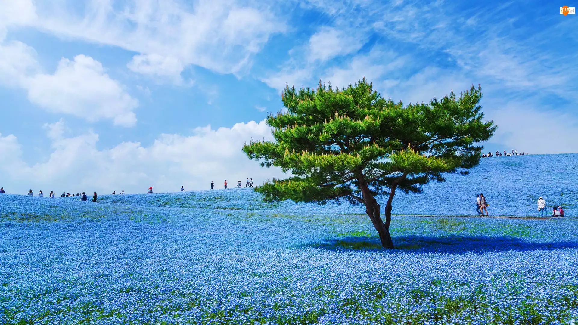 Hitachi Seaside Park, Łąka, Porcelanki Menziesa, Hitachinaka, Niebieskie, Drzewo, Japonia, Kwiaty