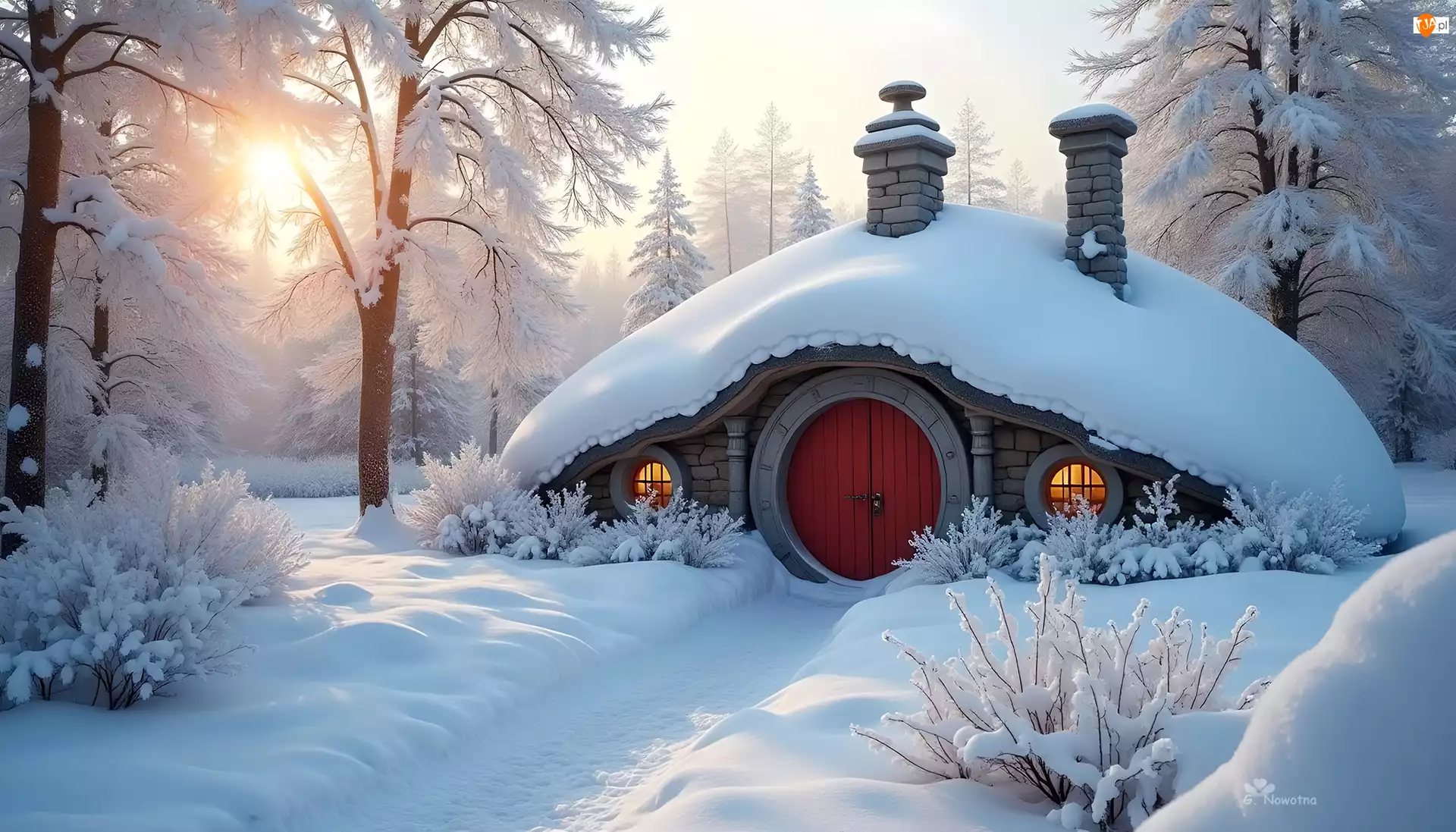 Hobbit, Domek, Śnieg, Grafika, Drzewa, Zima
