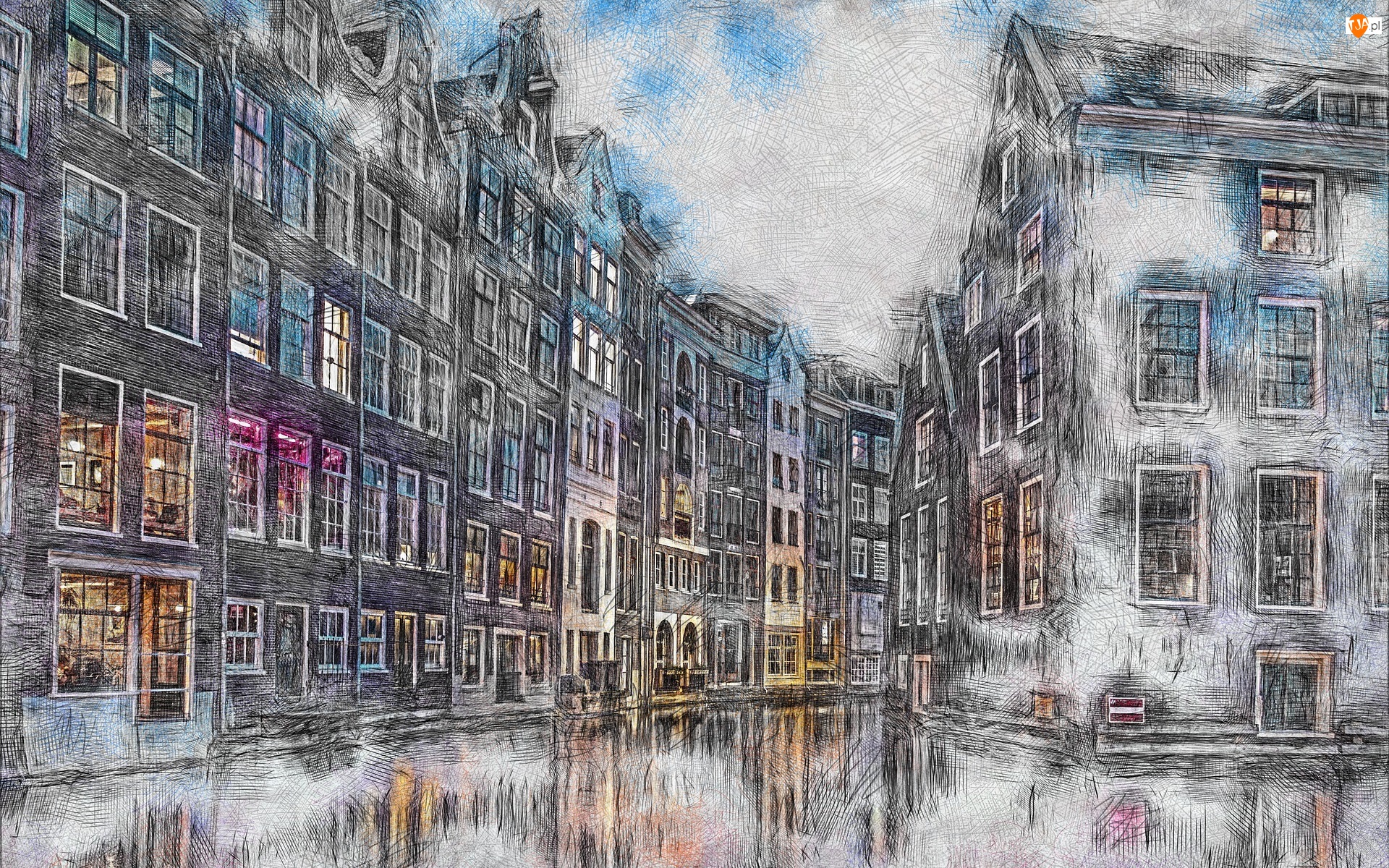 Holandia, Rzeka, Amsterdam, Grafika, Domy