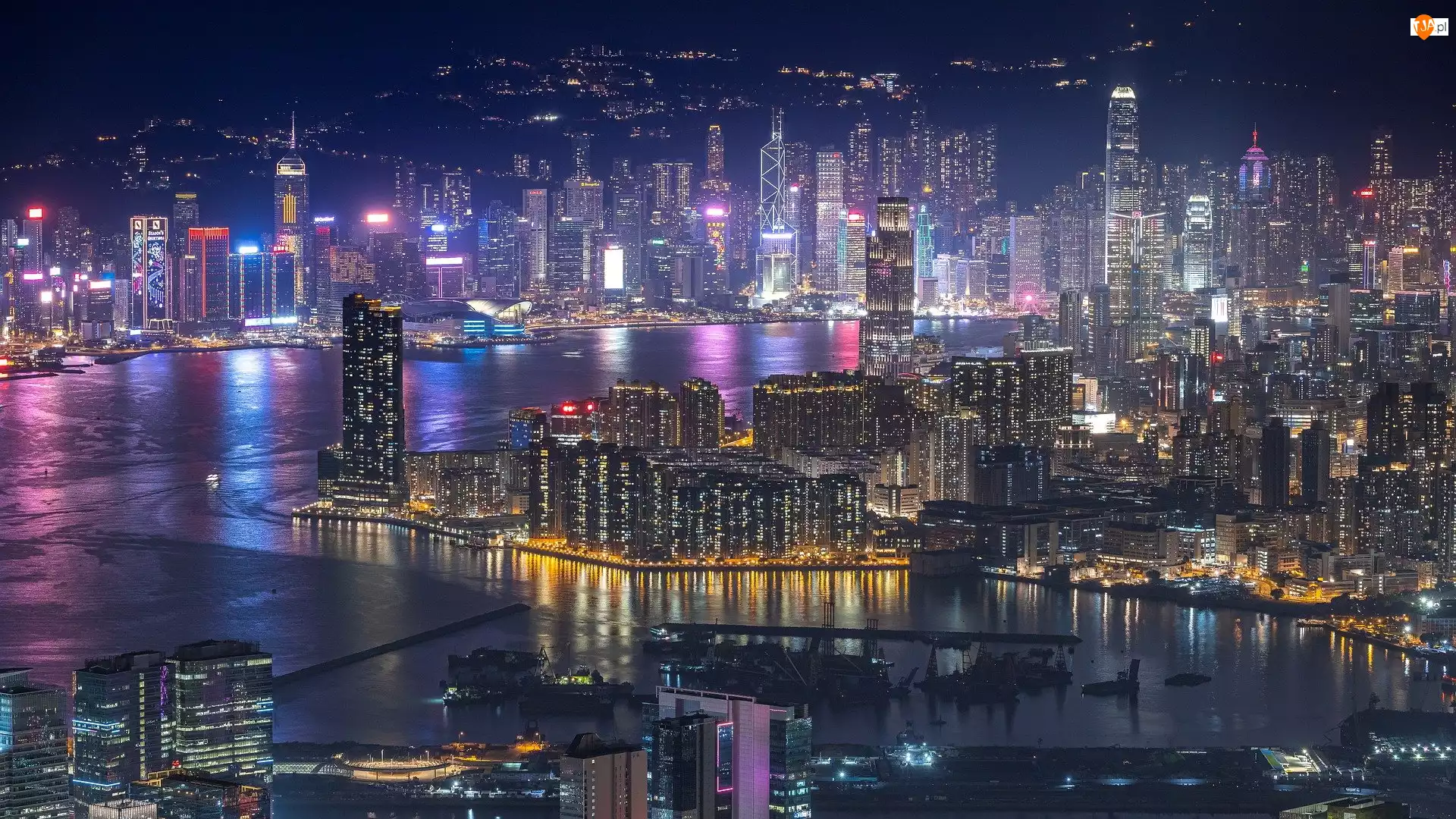 Chiny, Miasto nocą, Hongkong, Victoria Harbour, Rzeka Perłowa, Wieżowce, Zatoka, Noc, Port